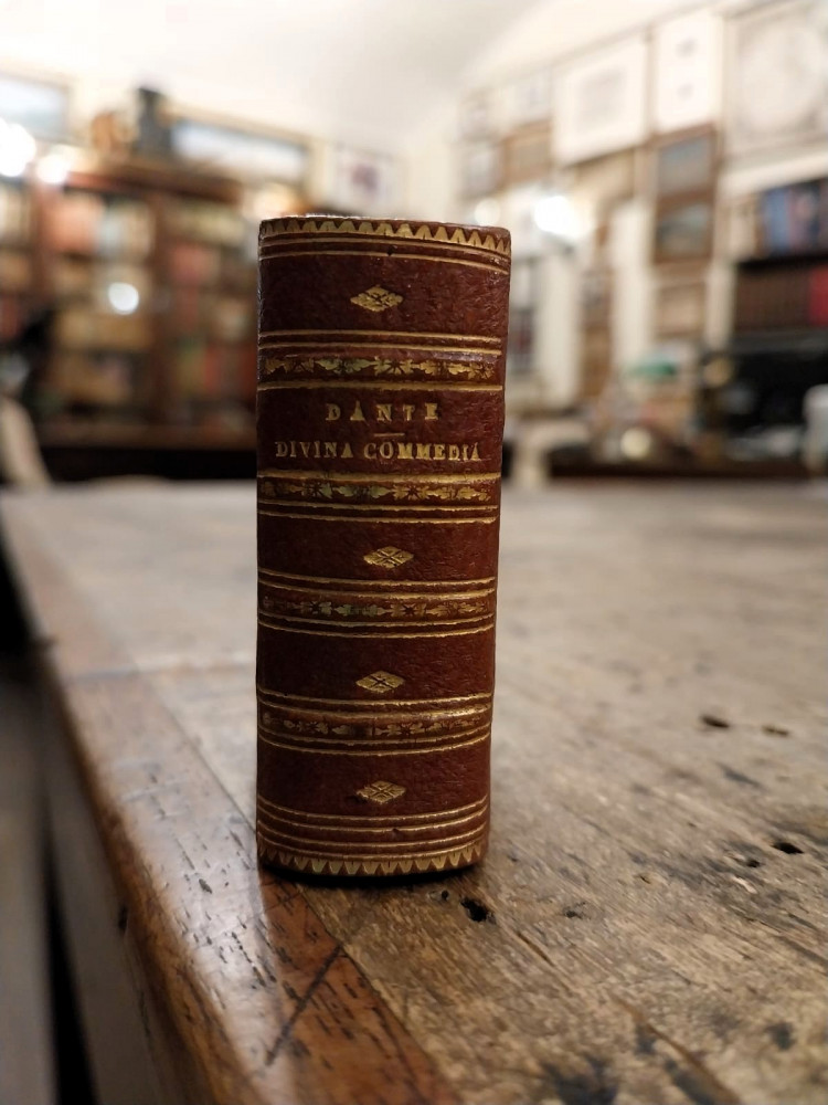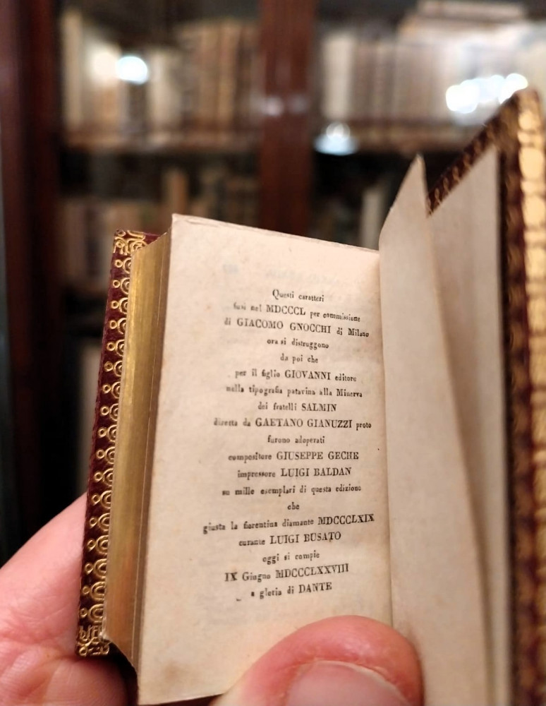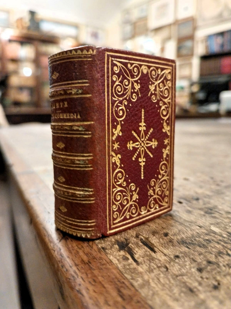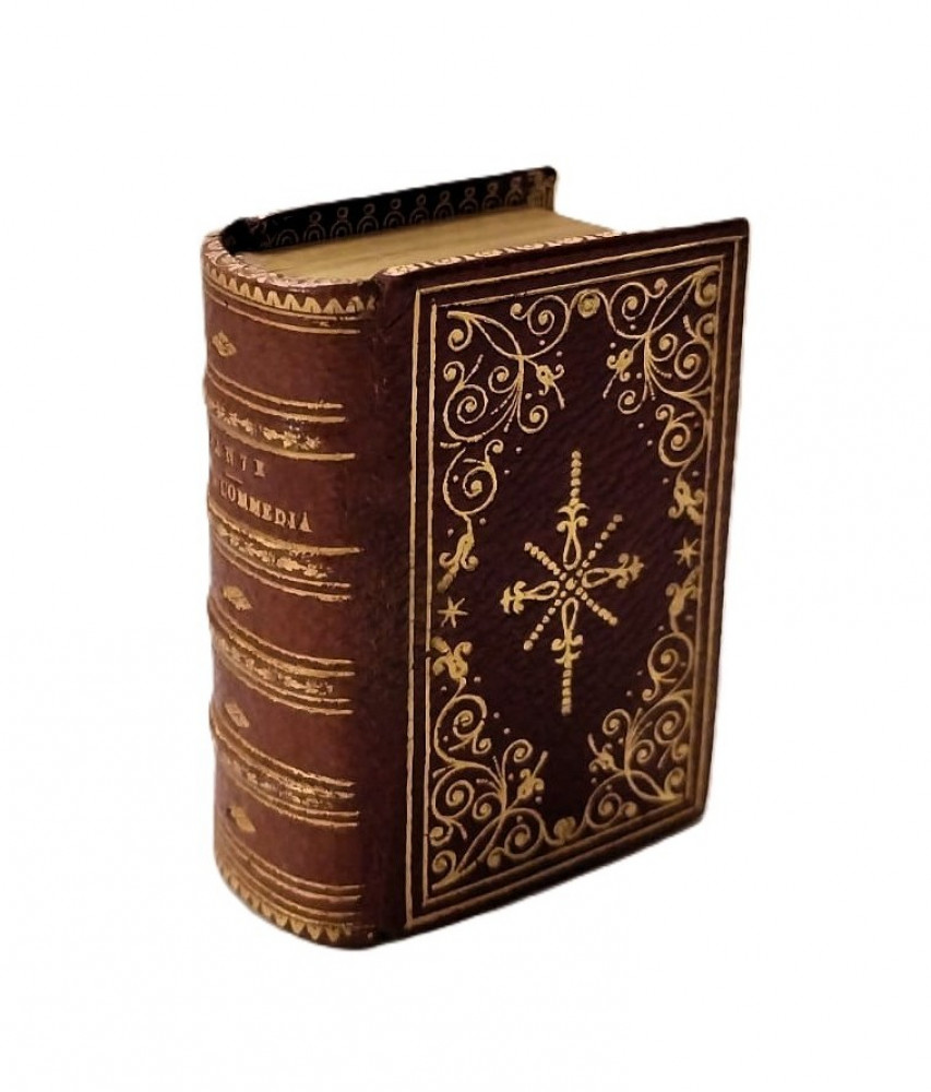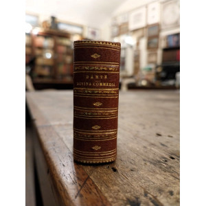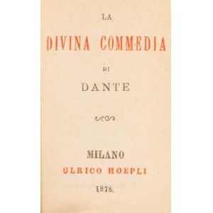 Rara e ricercata seconda tiratura della prima edizione della Divina Commedia impressa usando il minuscolo carattere detto "occhio di mosca". L'editore milanese Ulrico Hoepli acquistò dalla Tipografia Salmin di Padova i fogli singoli del "Dantino" stampati dall'editore Gnocchi nel 1878, assemblandoli e pubblicandoli assieme ad un nuovo frontespizio a suo nome e creando una nuova e raffinata minuscola legatura, nello stesso anno.