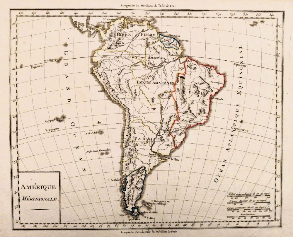 In basso a destra scale distanziometriche. Nell'angolo inferiore sinistro riquadro contenente la scritta "Amérique Méridionale".