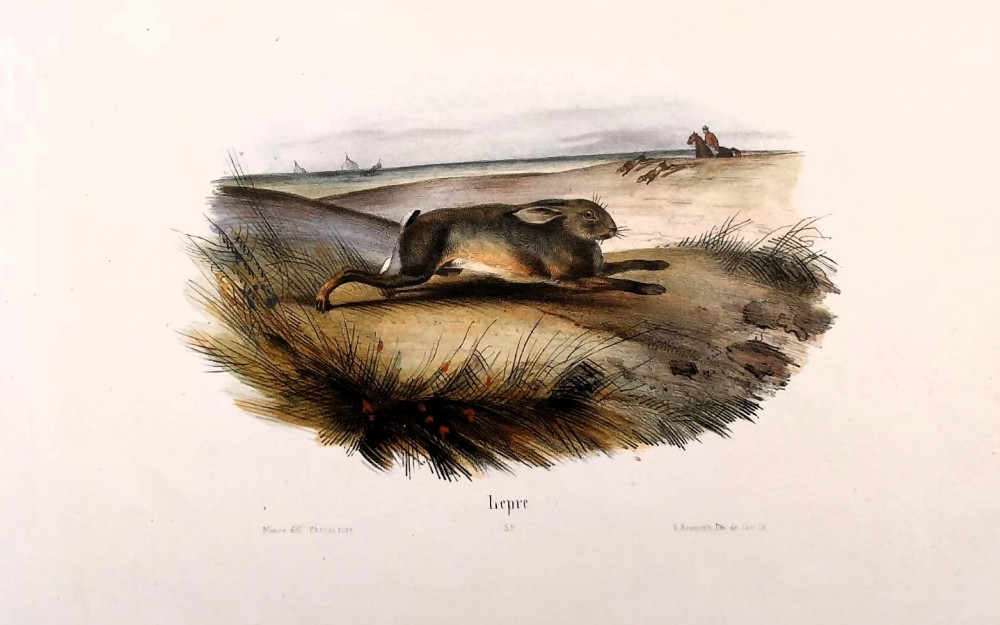 Questa esecuzione litografica finemente acquerellata, unisce precisione zoologia alla qualità artistica. L'immagine raffigura una lepre in primo piano braccata da cani da caccia, raffigurati in secondo piano.