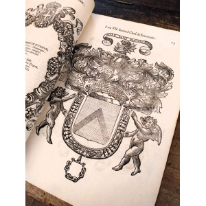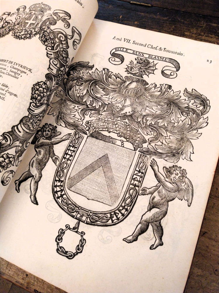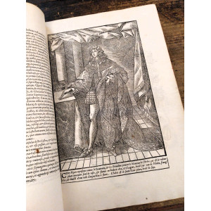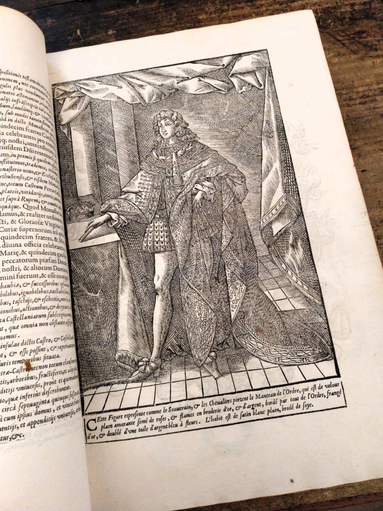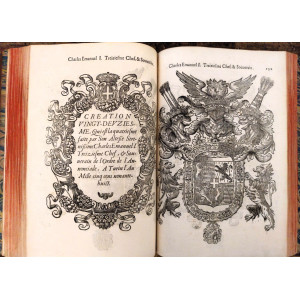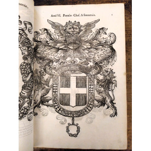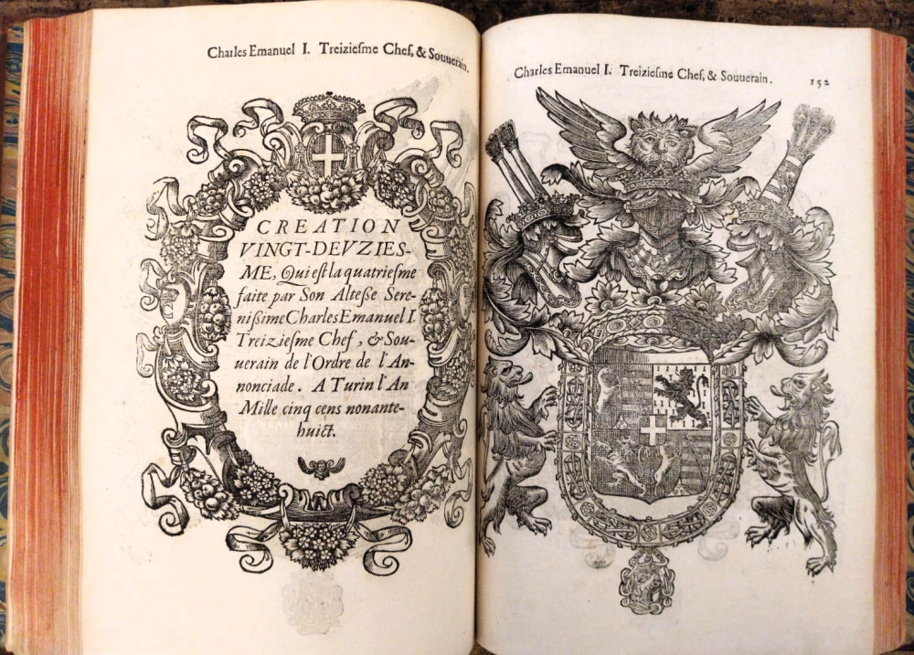 Frontespizio con marca editoriale raffigurante una fenice tra le fiamme che volge lo sguardo verso il sole, in basso al centro le iniziali BZ sormontate da croce e motto: Iuventus renovata. Testo in francese, bei capilettera e fregi xilografici, lettera dedicatoria dell’autore a Carlo Emanuele II, avviso al lettore, ritratto a piena pagina del duca di Savoia in abito di gran maestro dell’Ordine dell’Annunziata, stemmi a piena pagina eseguiti in xilografia, con le armi dei cavalieri dell’Ordine, comprese quelle dei sovrani sabaudi da Amedeo VI detto il Conte Verde (fondatore dell’ordine) fino al duca Carlo Emanuele II. Nella facciata a fronte di ciascuna arma sono riportati il nome del cavaliere e i titoli nobiliari, con la descrizione dello stemma, in fine esteso indice.