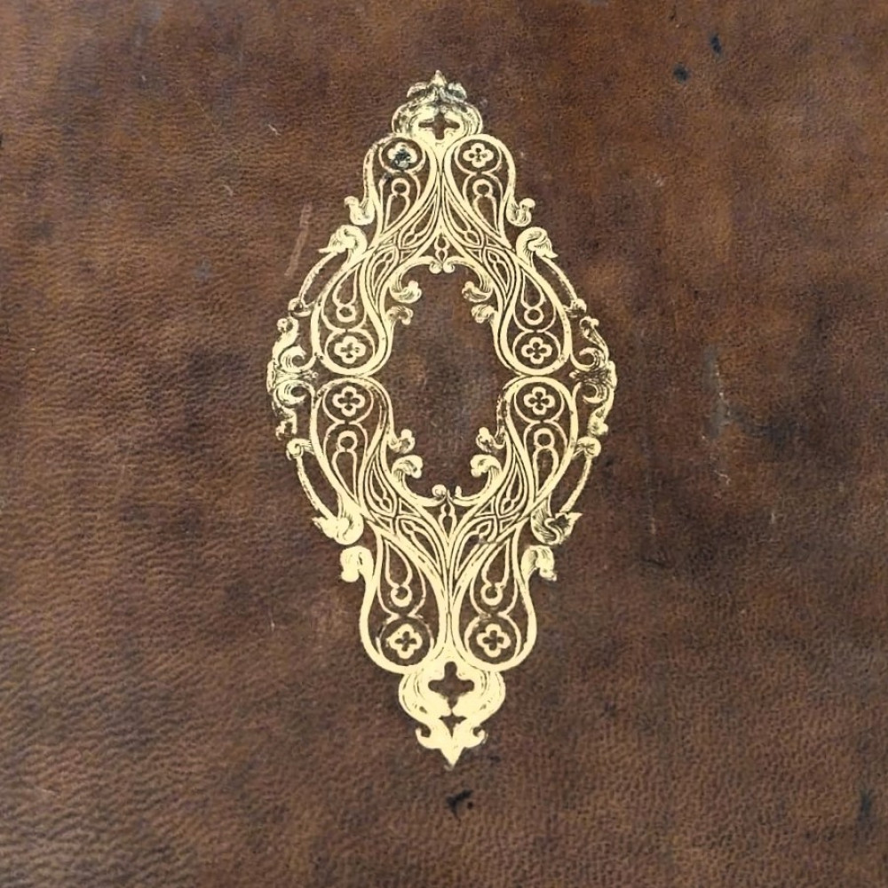 Legatura del Settecento in pieno cuoio marrone, doppio filetto dorato ai piatti che racchiude un rosone centrale impresso in oro, dorso a 6 nervi con titoli in oro e ferri fitomorfi entro ogni comparto, sguardie in carta policroma marmorizzata, tagli rossi.