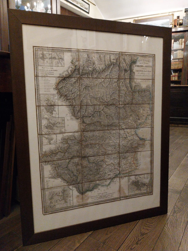 Dettagliata carta geografica raffigurante le divisioni di Torino e di Aosta, dedicata al Re Carlo Alberto di Savoia (*Torino 1798 - †Oporto 1849), arricchita da sei carte topografiche raffiguranti: Aosta, Pinerolo, Susa, Ivrea, Biella e Torino.