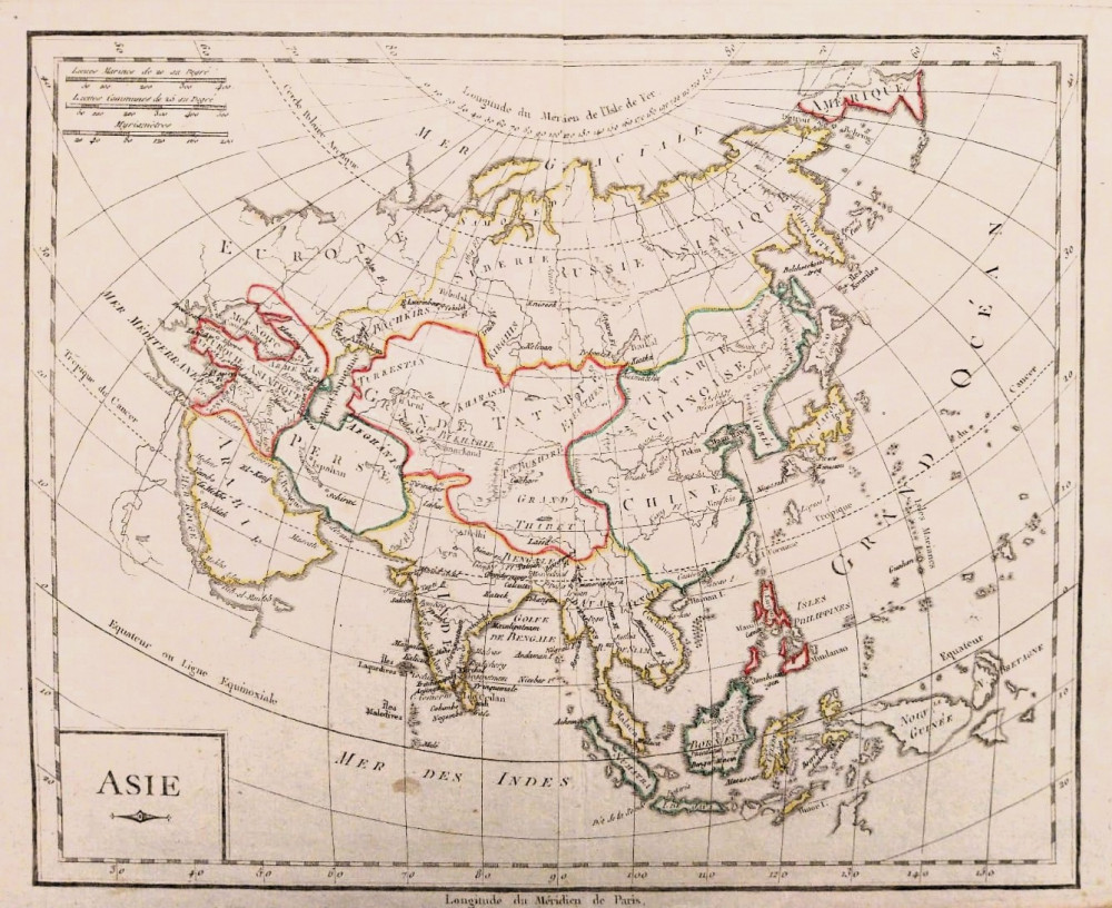 In basso a destra scale distanziometriche. Nell'angolo inferiore sinistro riquadro contenente la scritta "Asie".