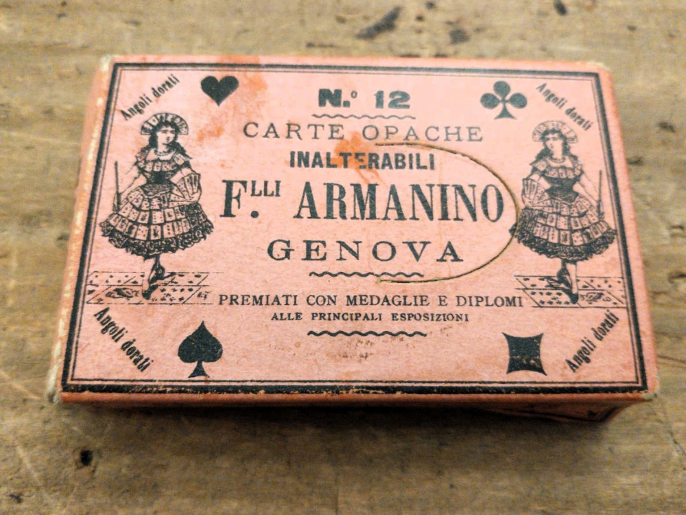 Raro mazzo di 52 carte da gioco genovesi diviso nei quattro semi, composto da 10 carte numeriche, dall'uno (asso) al dieci, fante, regina e re. L'asso di cuori presenta il nome del produttore Fratelli Armanino, dove è presente inoltre il bollo di tassazione datato Genn. 1894.