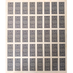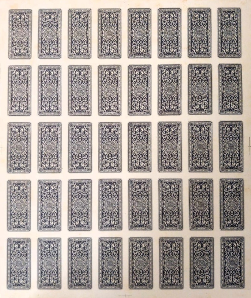 Foglio di carte da gioco triestine non tagliato, acquerellato a mano all’epoca utilizzando la tecnica “pochoir”.