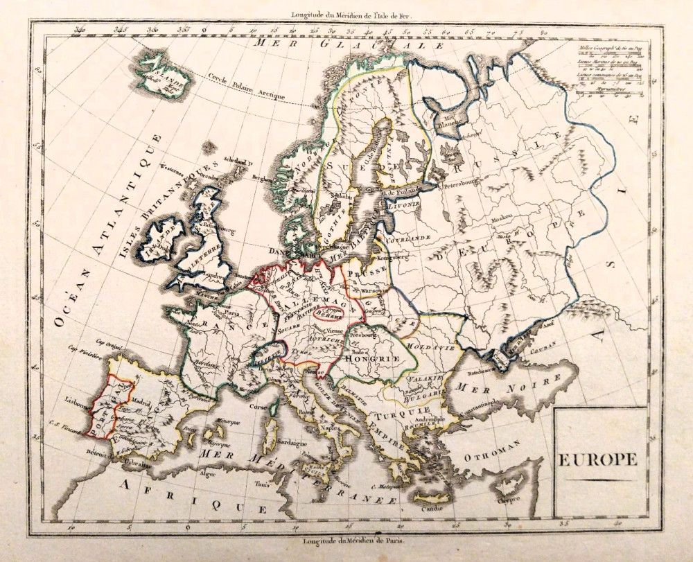 Interessante carta geografica raffigurante l'intero continente europeo, tratta dall'atlante di Edme Mentelle e Conrad Malte-Brun "Géographie Mathématique, Physique et Politique de Toutes les Parties du Monde".