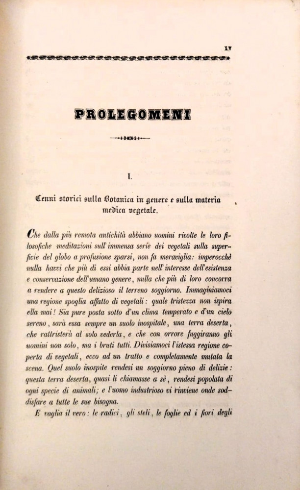 L'opera è introdotta da cenni storici sulla botanica e sulla materia medica-vegetale, sull'azione dei medicamenti, dei mezzi per "isvelare" l'azione e la dose dei medicamenti e la somministrazione.