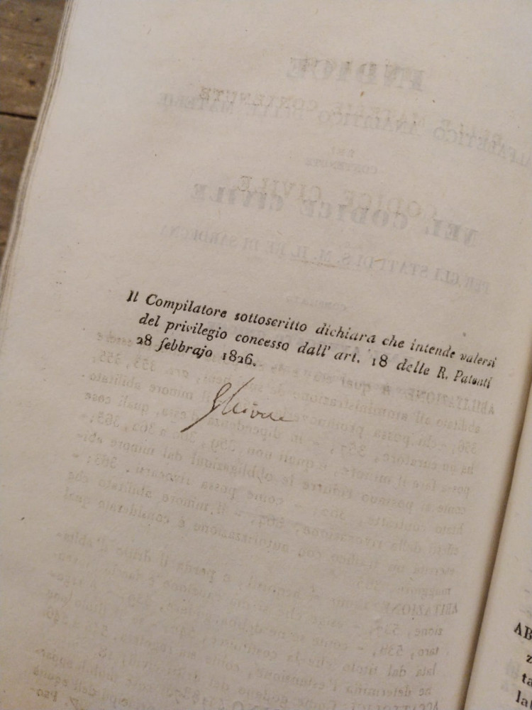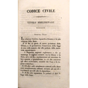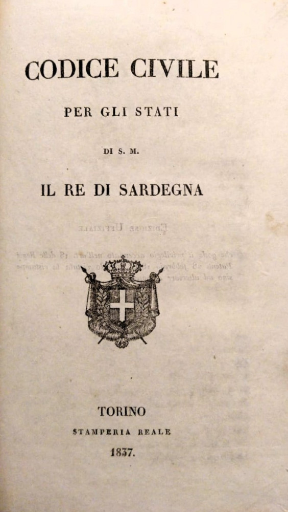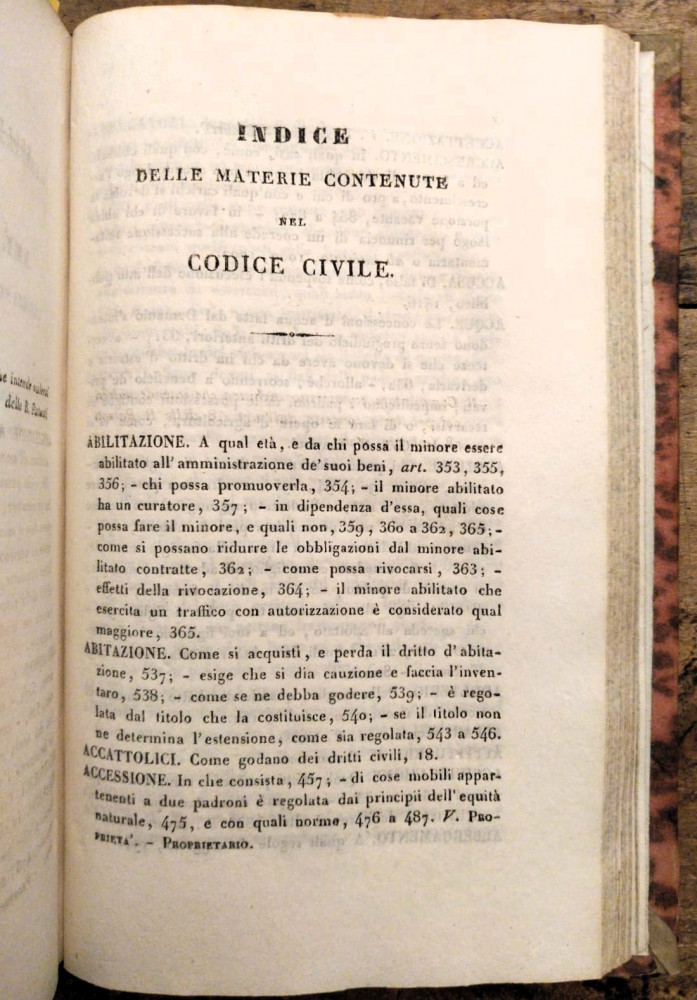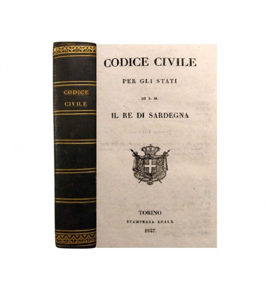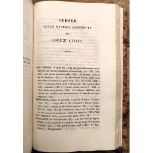 Prima edizione del Codice Civile Albertino. Il trattato è legato con l'indice alfabetico-analitico delle materie contenute nel Codice civile, compilato dall'Avvocato Ghione, sostituto segretario civile del Senato del Piemonte.