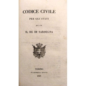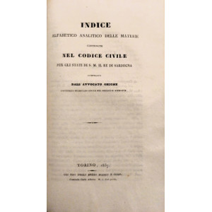 Codice civile per gli Stati di S.M. Re di Sardegna. Torino, Stamperia Reale, 1837, legato con Indice alfabetico analitico delle materie contenute nel Codice […]. Torino, Coi Tipi degli Eredi Bianco e Comp., 1837.