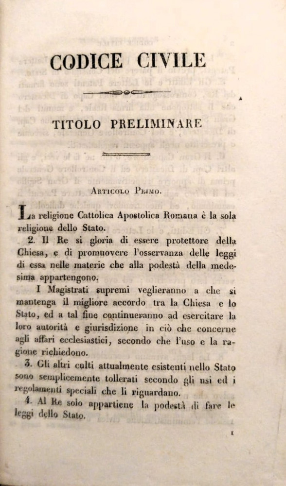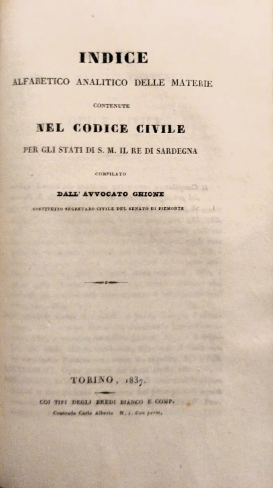 Prima edizione del Codice Civile Albertino. Il codice è diviso in tre parti: la prima tratta  delle persone, la seconda della proprietà e la terza come si acquisisce la proprietà. Il trattato è legato con l'indice alfabetico-analitico delle materie contenute nel Codice civile, compilato dall'Avvocato Ghione, sostituto segretario civile del Senato del Piemonte. Questa seconda parte, utile all'uso del codice, difficilmente risulta unita alla prima parte.