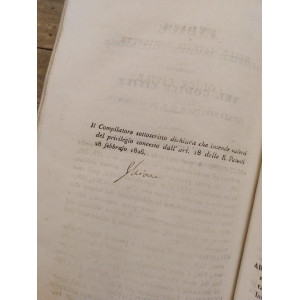 Occhietto, frontespizio con fregio tipografico, al verso firma manoscritta del sostituto segretario civile del Senato del Piemonte Ghione, concesso dall'art. 18 delle Regie Patenti del 28 febbraio 1826.