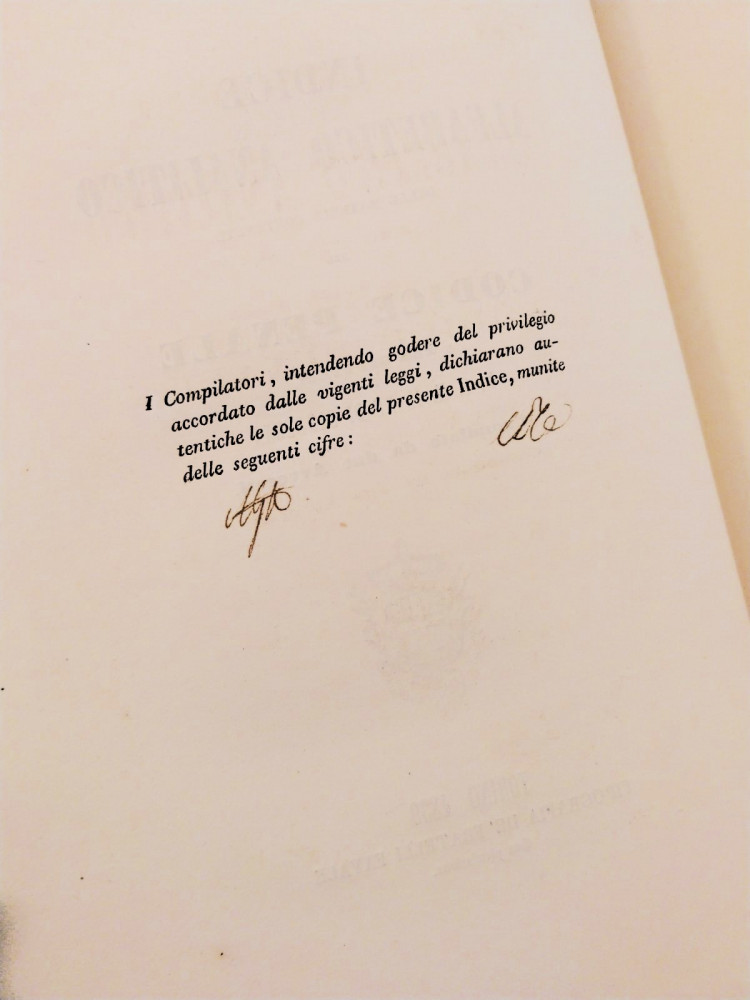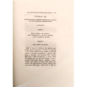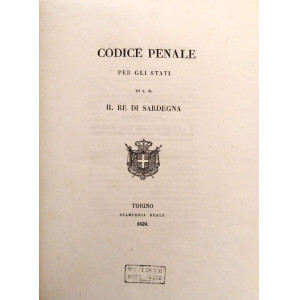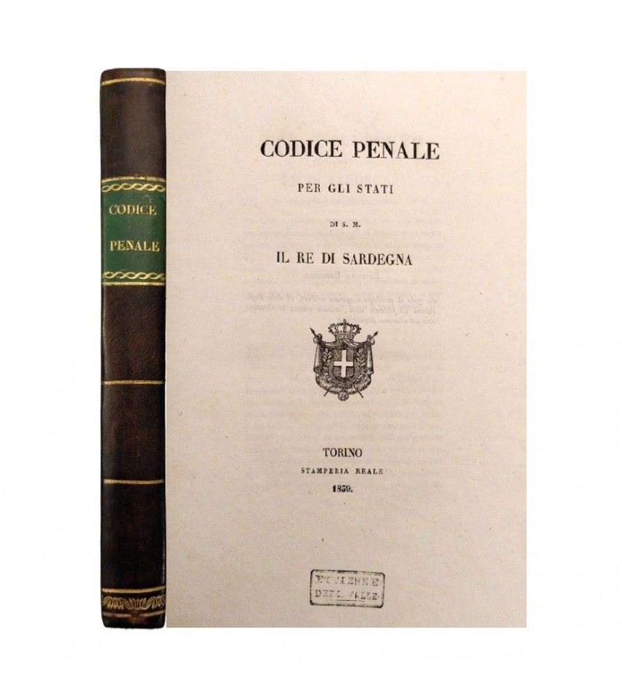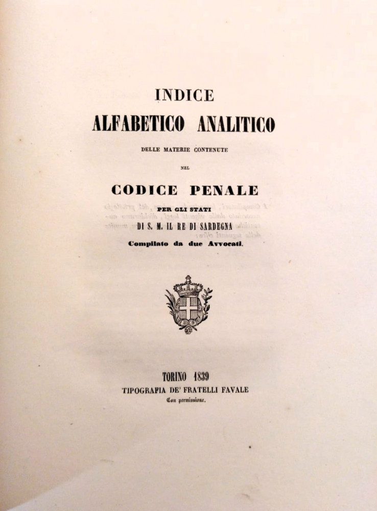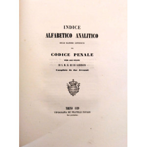 Codice penale per gli Stati di S.M. il Re di Sardegna. Torino, Stamperia Reale, 1839, legato con Indice alfabetico analitico delle materie contenute nel Codice penale per gli Stati di S.M. il Re di Sardegna. Torino, Tipografia de' fratelli Favale, 1839.