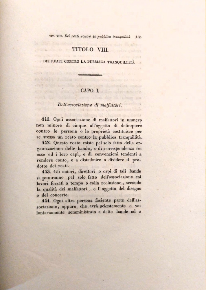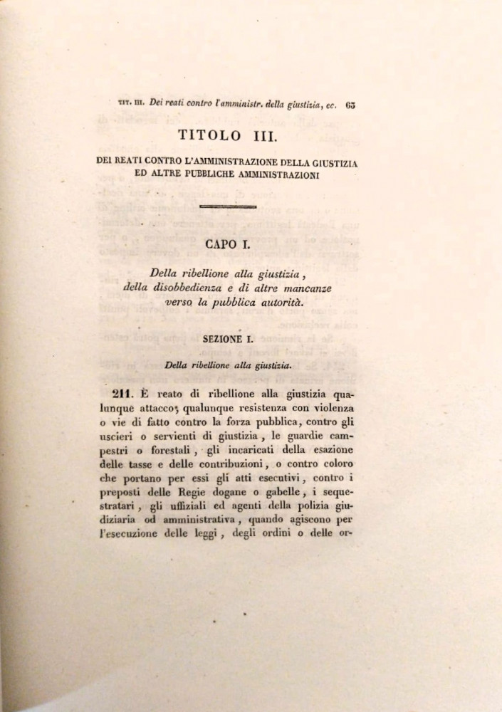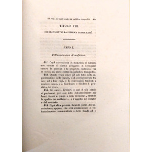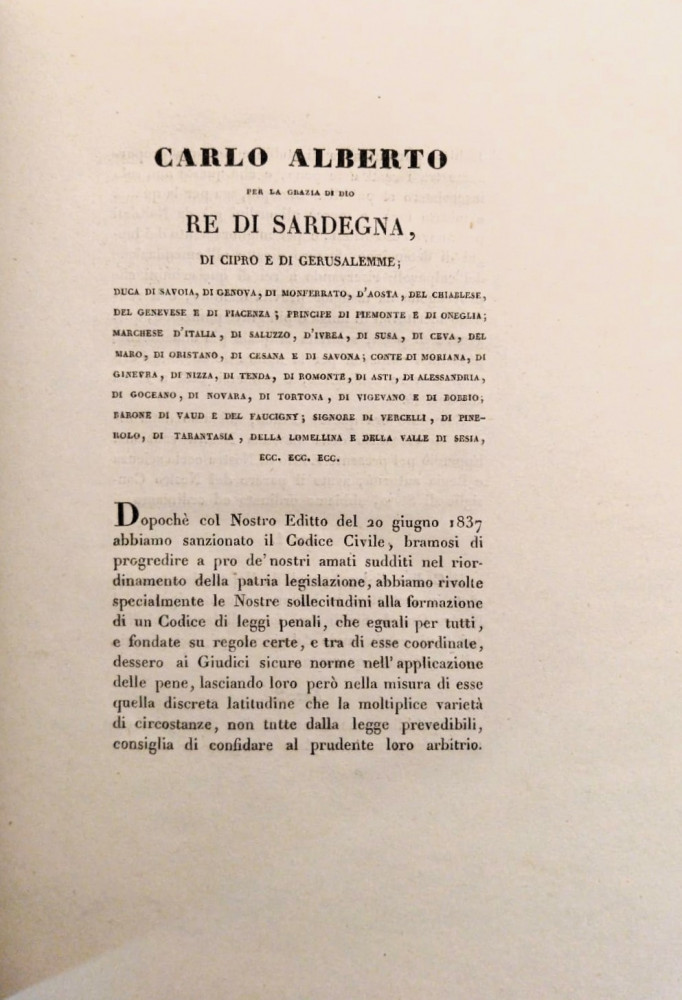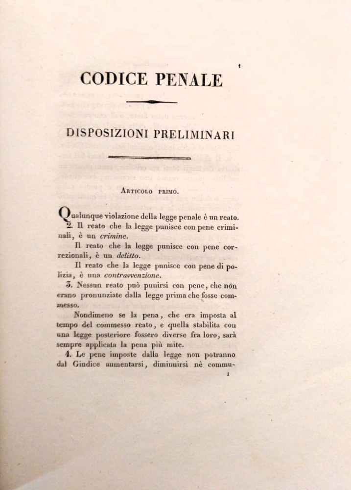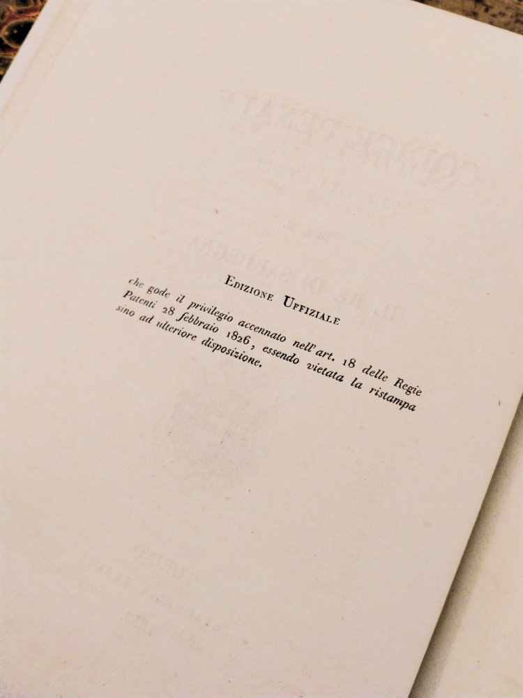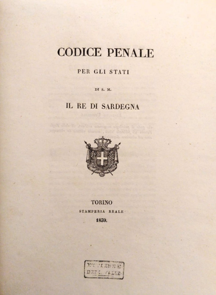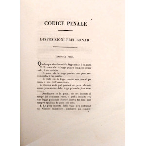 Prima edizione del codice penale Albertino. Il codice è diviso in tre parti: la prima tratta delle pene e delle regole per la loro applicazione ed esecuzione, la seconda dei crimini, dei delitti e delle loro pene e la terza delle contravvenzioni e delle loro pene.