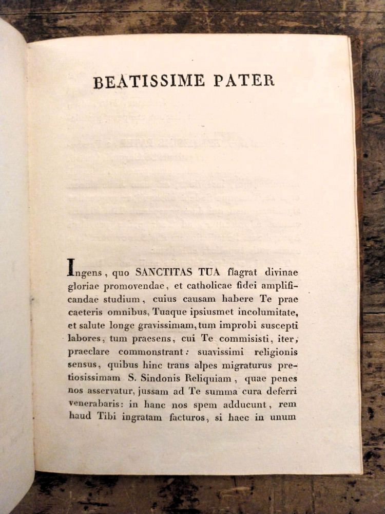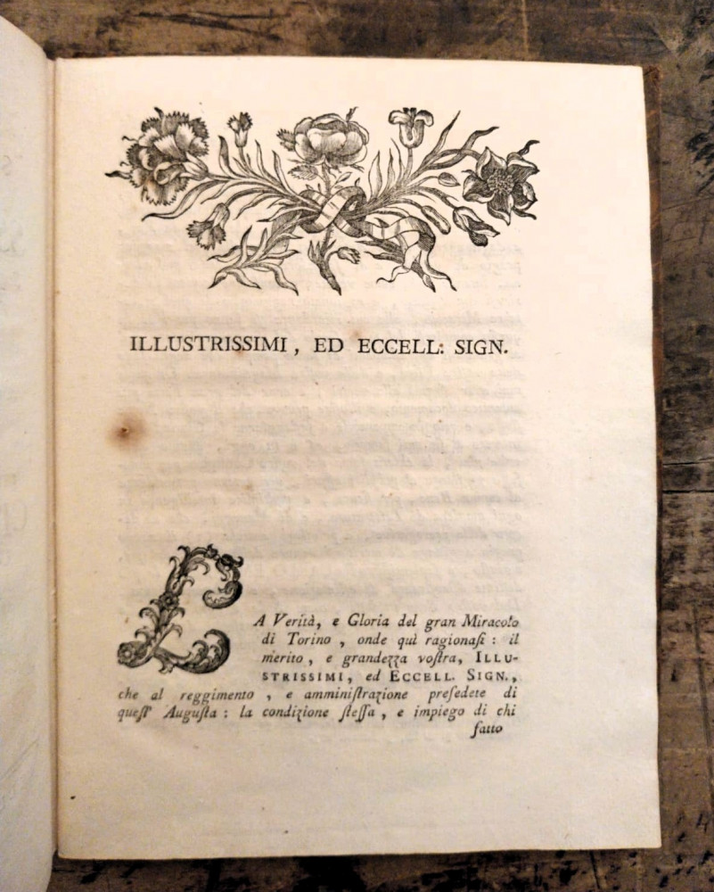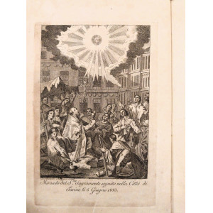 Antiporta incisa da Giambattista Stagnon raffigurante il miracolo del Santissimo Sacramento del 1453: nella piazza del Corpus Domini è raffigurato in primo piano il Vescovo di Torino, Mons. Ludovico di Romagnano, circondato da fedeli e che sorregge il calice in atto di raccogliere l’Ostia, ancora sospesa nel cielo; occhietto, dedica in latino a Pio VII, frontespizio con marca tipografica, capilettera, testatine e finalini istoriati in xilografia, dedica del canonico Giovanni Angelo Colombo.