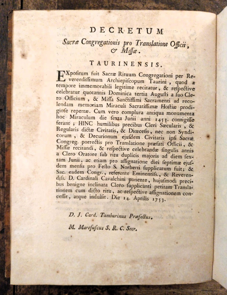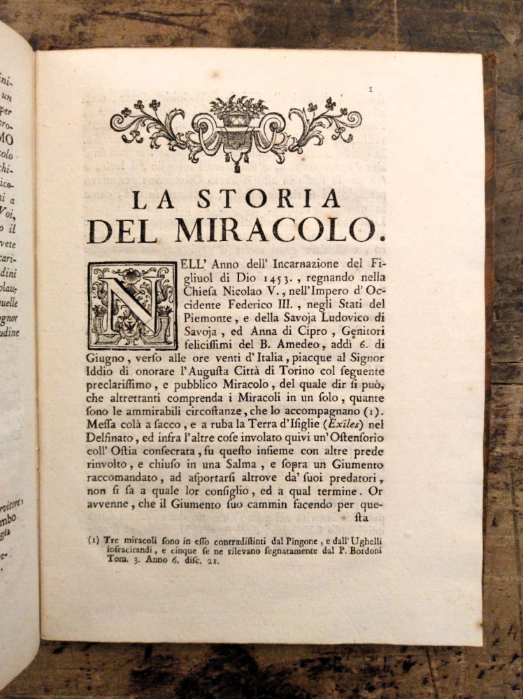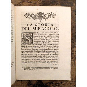 Rara opera di carattere storico sul miracolo del Santissimo Sacramento accaduto a Torino il 6 giugno del 1453.