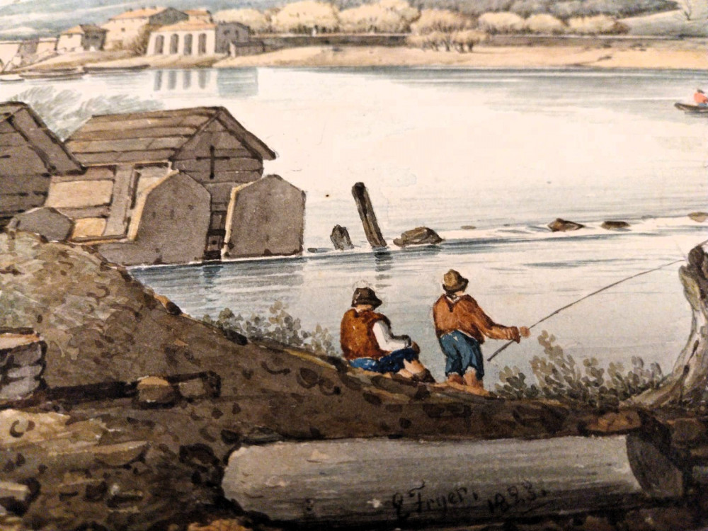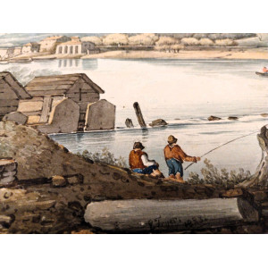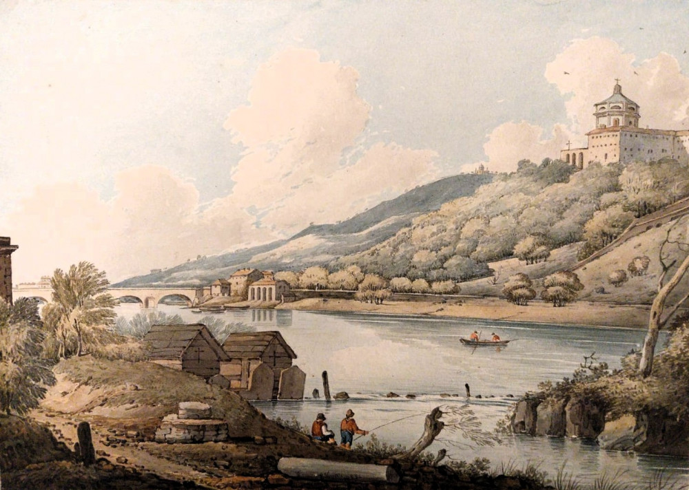 Veduta prospettica delle rive del Po nei pressi dei Murazzi costruiti durante il XIX secolo per preservare la città dalle piene del fiume, con il Monte dei Cappuccini, il ponte Vittorio Emanuele I, alcune abitazioni facenti parte del Borgo Po e la Basilica di Superga sullo sfondo. Alcuni pescatori in primo piano e un'imbarcazione sul fiume animano la scena.