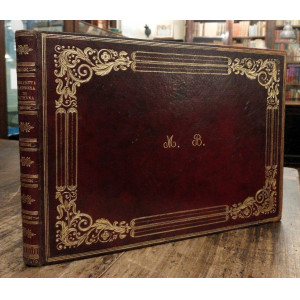 Legatura in piena pelle  bordeaux dell'epoca, ai piatti elegante cornice che racchiude a quello anteriore il monogramma M. B. (Marianna Brighenti) impresso in oro, dorso a 5 nervi con titolo, fregi, ferri , greche e filetti dorati, labbri e unghiatura con motivi fitomorfi a rotella in oro, sguardie marmorizzate, tagli dorati.