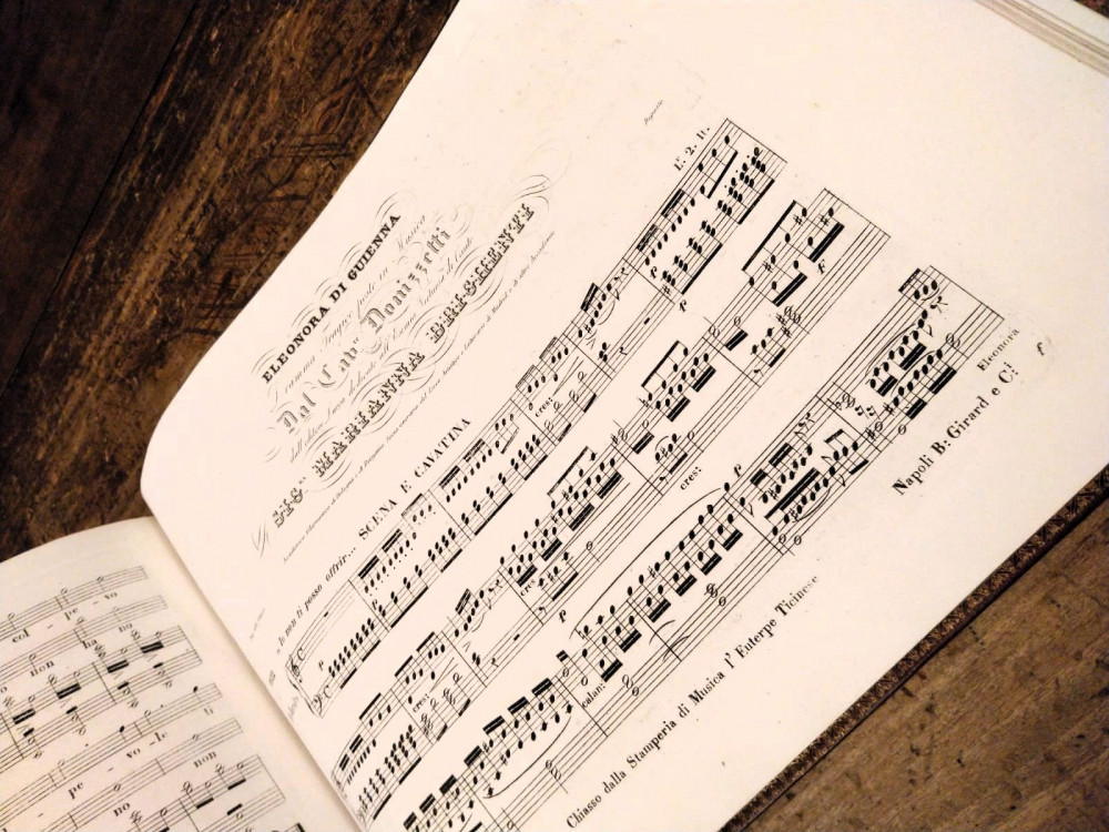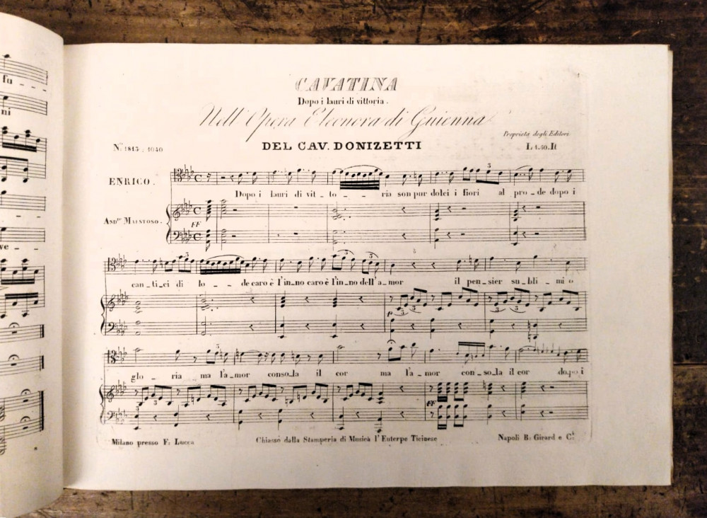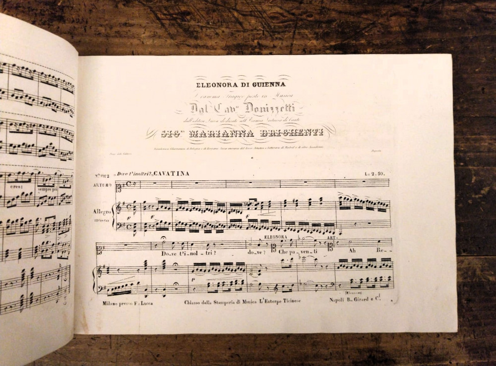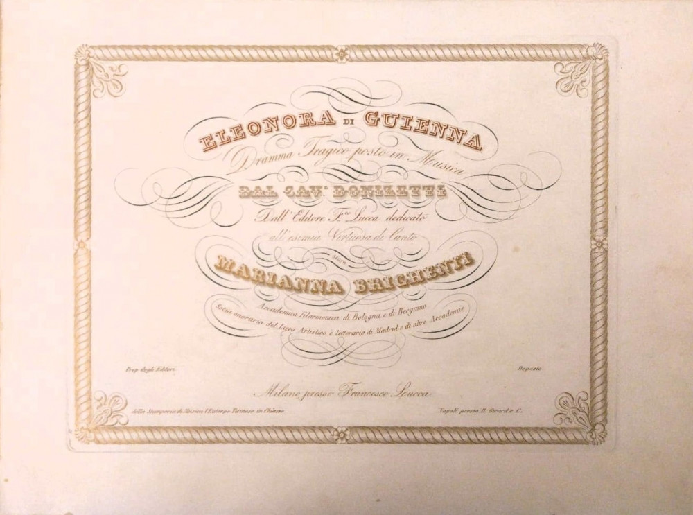 Donizetti, Gaetano. Eleonora di Guienna. Dramma Tragico posto in Musica dal Cav.e Donizetti dall'Editore F.co Lucca, dedicato all'esimia virtuosa di Canto Sig.ra Marianna Brighenti. Milano, Francesco Lucca, s.d. (1837).