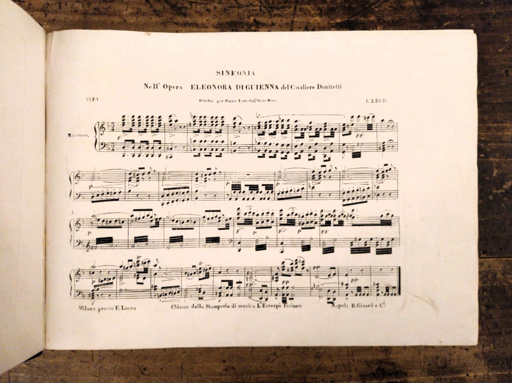 La presente copia è uno dei primi esemplari che indicano Euterpe Ticinese come editore principale e formale comproprietario, con subordinati i riferimenti a "Milano presso F. Lucca" (Francesco Lucca *1802 -†1872) e “Napoli B. Girard. e C.".