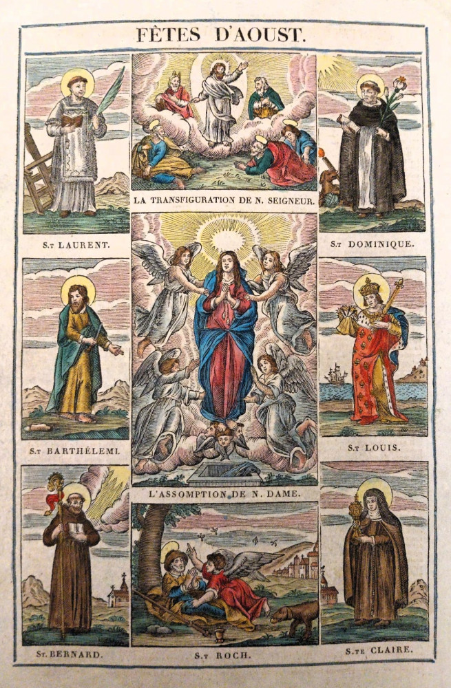 Rara esecuzione incisoria nella quale sono riportate le iconografie dei santi e degli eventi significativi del mese di agosto.