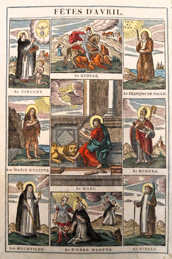 Rara esecuzione incisoria nella quale sono riportate le iconografie dei santi e degli eventi significativi del mese di aprile.