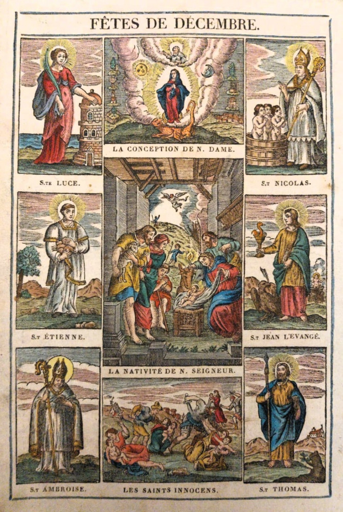 Rara esecuzione incisoria nella quale sono riportate le iconografie dei santi e degli eventi significativi del mese di dicembre.