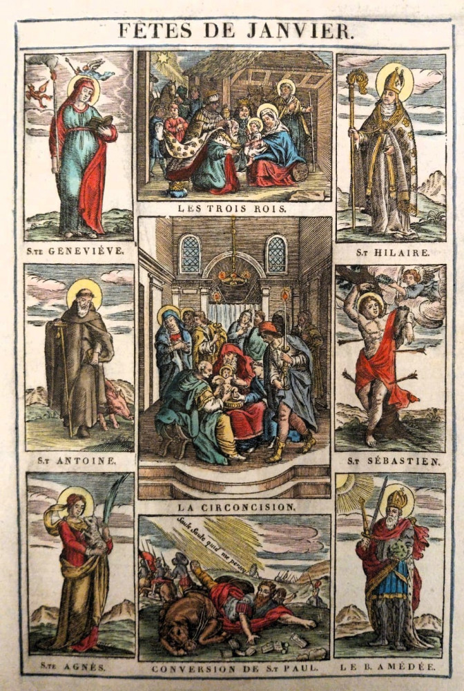 Rara esecuzione incisoria nella quale sono riportate le iconografie dei santi e degli eventi significativi del mese di gennaio.