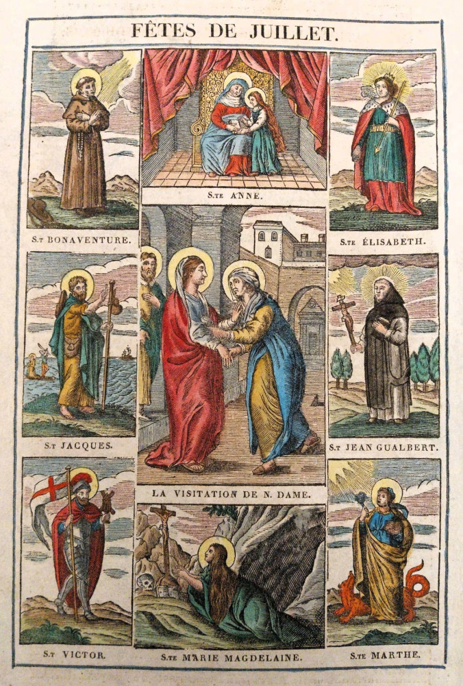 Rara esecuzione incisoria nella quale sono riportate le iconografie dei santi e degli eventi significativi del mese di luglio.