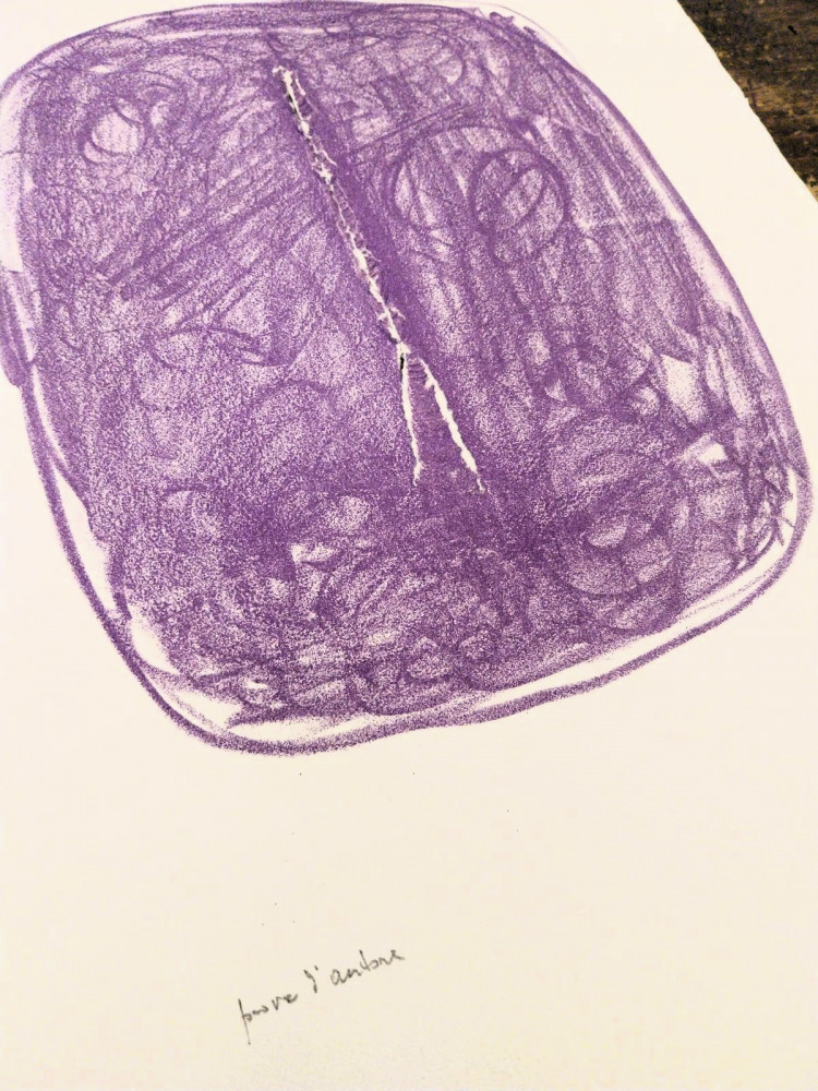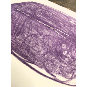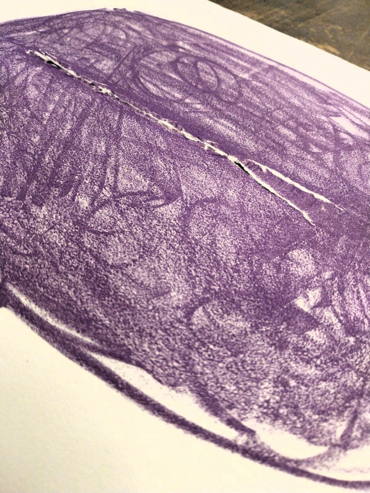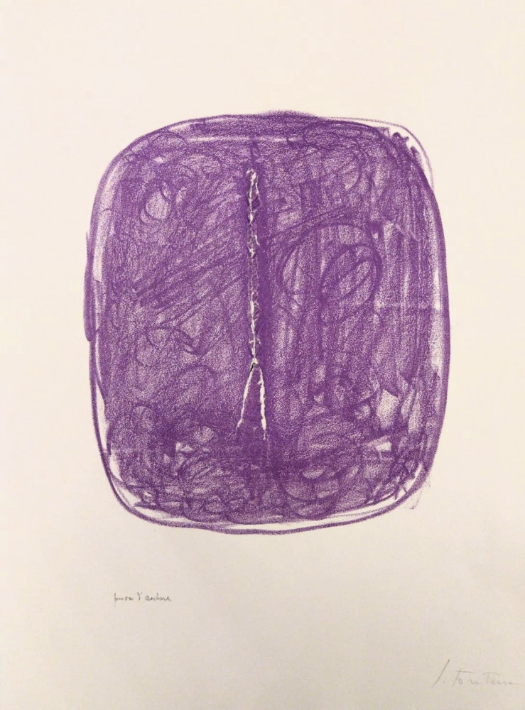 Litografia originale in tinta viola, con strappo originale di Fontana, firmata e siglata prova d'autore dall’artista (mm 350 x 470 il foglio).
