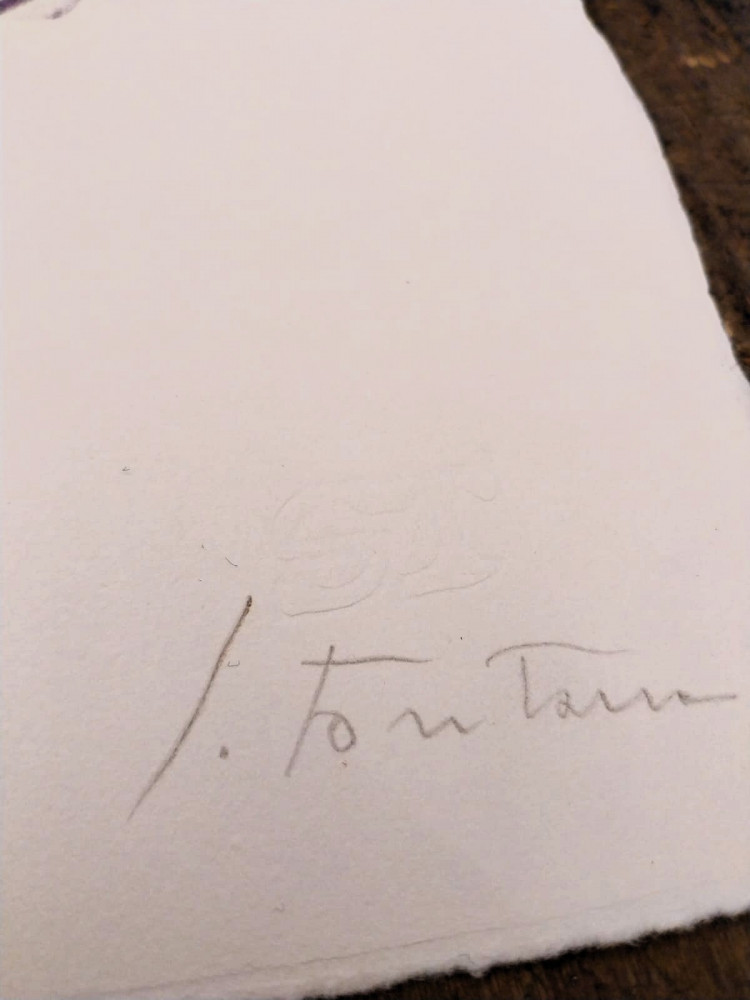 Litografia originale in tinta viola, con strappo originale di Fontana, firmata e siglata prova d'autore dall’artista, reso ancora più interessante per l'autentica firmata dall'editore Teodorani sulla propria carta intestata, datata 5 ottobre 1989, controfirmato al verso dal gallerista Beppe Pietra di Pavia in data 19 marzo 1990.