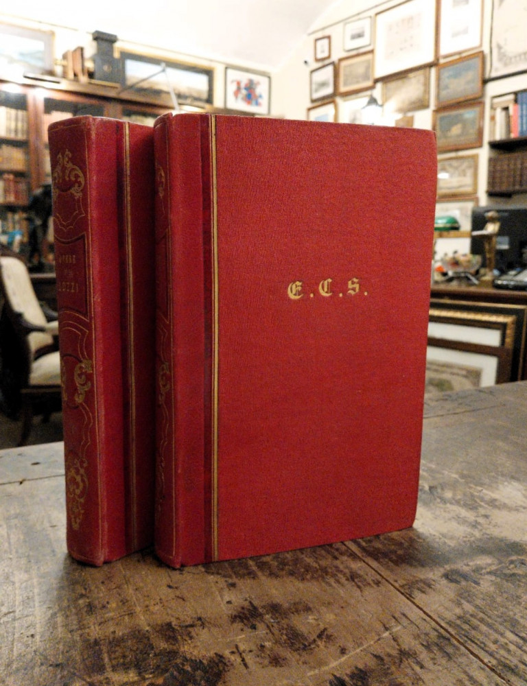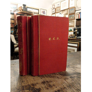 Legature dell’epoca in mezzo marocchino rosso, piatti in tela percallina rossa con monogrammi centrali impressi in oro, dorsi riccamente decorati con titoli e ferri fitomorfi dorati, sguardie in carta seta floreale, tagli spruzzati.