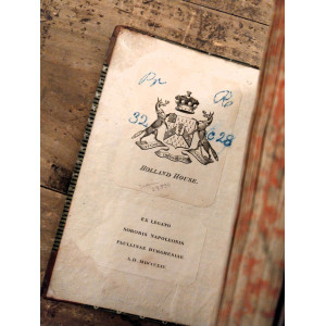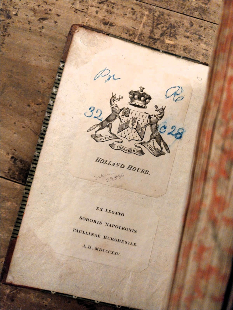 Interessante esemplare con applicato all’interno del piatto anteriore l'ex-libris "Sororis Napoleonis Paullinae Burghesiae A.D. MDCCCXXV" di appartenenza a Maria Paola Bonaparte, conosciuta semplicemente come Paolina Bonaparte, principessa italiana sorella minore dell'imperatore francese Napoleone Bonaparte e dall’ex-libris della Biblioteca Holland House di Londra, seriamente bombardata dai tedeschi nella Seconda Guerra Mondiale.