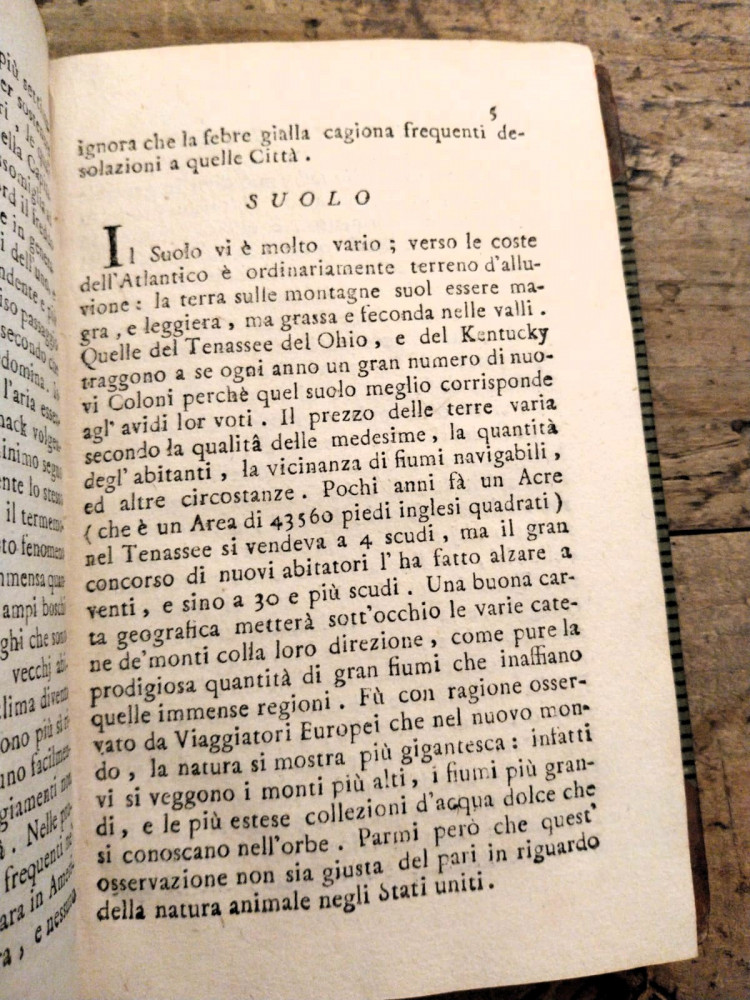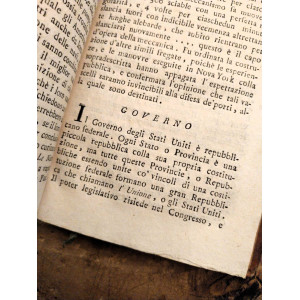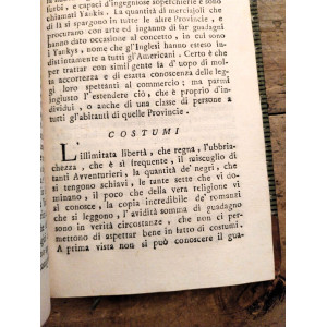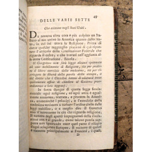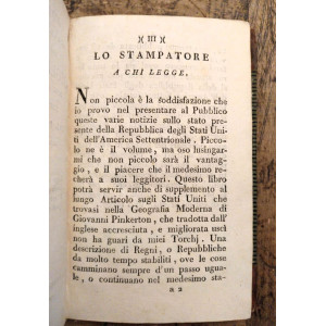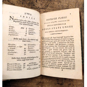 Edizione originale di questa interessante relazione di viaggiatori italiani sul territorio degli Stati Uniti d'America. L'esemplare è arricchito dall'ex-libris "Sororis Napoleonis Paullinae Burghesiae A.D. MDCCCXXV" di appartenenza a Maria Paola Bonaparte, conosciuta semplicemente come Paolina Bonaparte, principessa italiana sorella minore dell'imperatore francese Napoleone Bonaparte e dall’ex-libris della Biblioteca Holland House di Londra, seriamente bombardata dai tedeschi nella Seconda Guerra Mondiale.