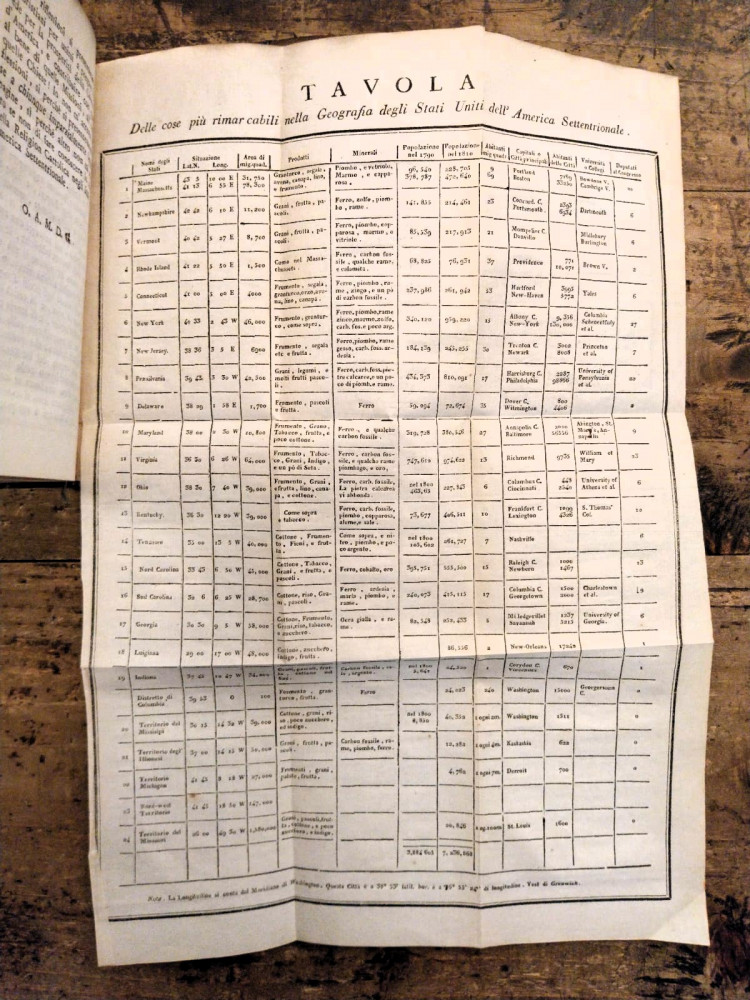 Alla fine del volume, è presente una grande tavola ripiegata contenente, per ciascuno degli Stati allora federati, notizie circa i prodotti agricoli e minerari, la popolazione, le città, i Collegi e le  Università presenti.