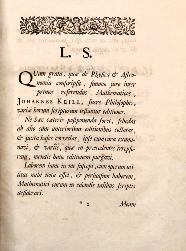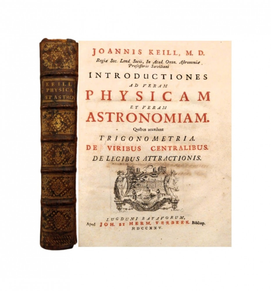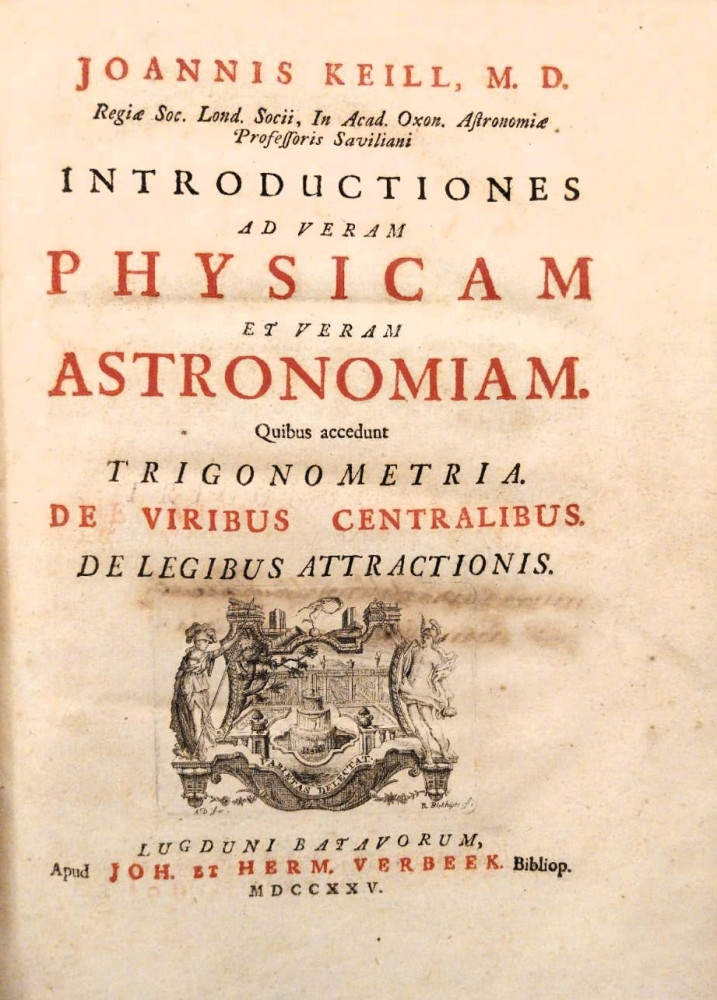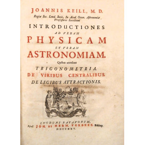 Keill, John. Introductiones ad veram physicam et veram astronomiam. Quibus accedunt Trigonometria. De viribus centralibus. De legibus attractionis. Lione, Johanes & Hermanus Verbeek, 1725.