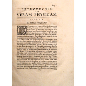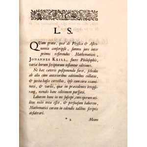 Importante opera scientifica, in prima edizione, del matematico e fisico scozzese John Keill (*Edimburgo 1671 - †Oxford 1721). Nel presente trattato vengono presentati i principi della fisica newtoniana, della gravità e dell'astronomia, includendo la trigonometria sulle forze centrali e le leggi di Keplero, con enfasi sulle leggi matematiche. È un testo fondamentale e di riferimento per lo studio e l'approccio alla scienza moderna nel Settecento. Le tavole raffiguranti la superficie della luna  dopo la pag. 296 risultano di notevole interesse.