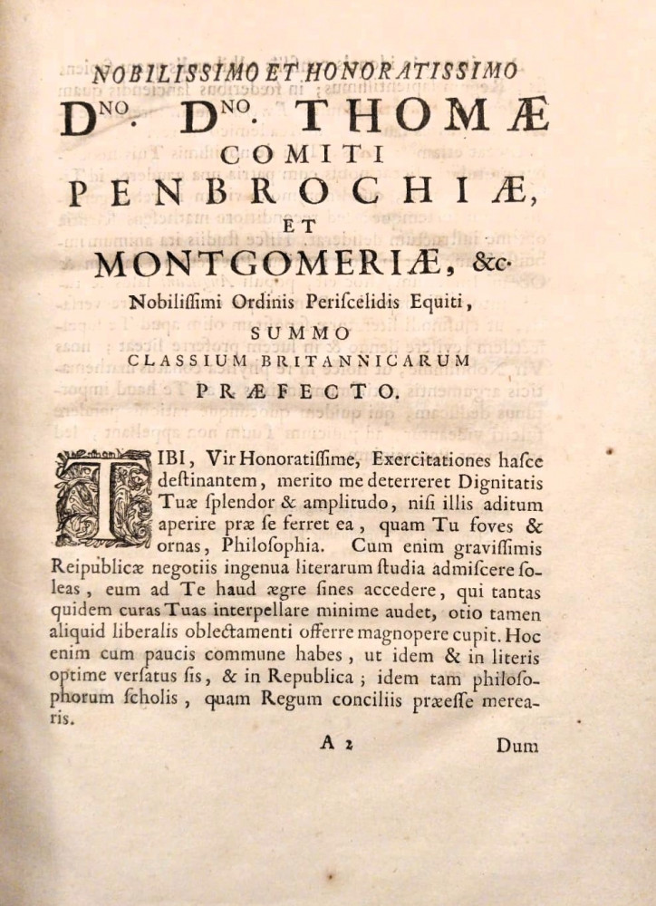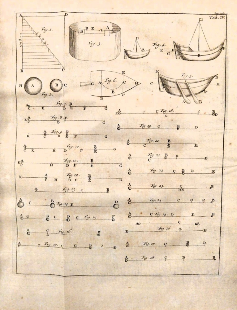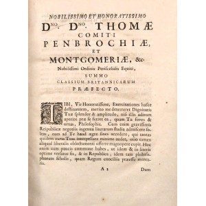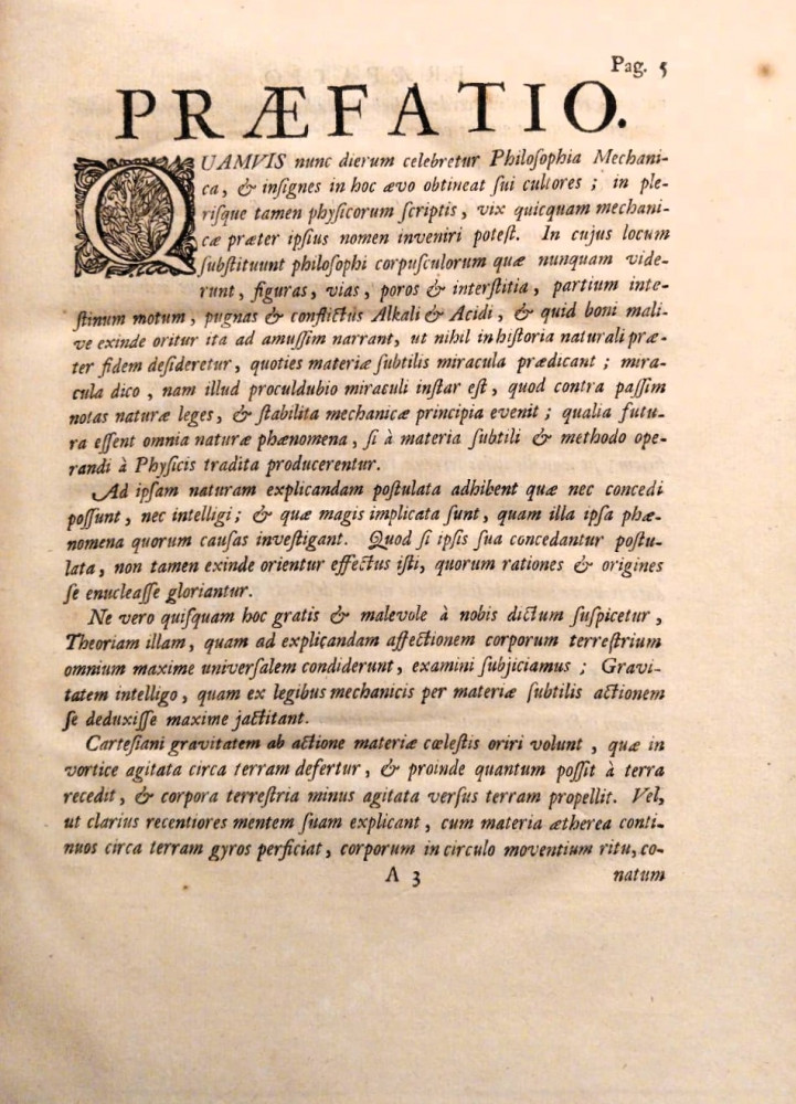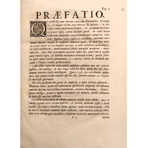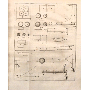 Frontespizio in caratteri rossi e neri, con marca calcografica non controllata (fontana, Minerva e Mercurio ai lati e allegoria della fortuna in alto, motto: Varietas delectat), incisa da Renier Blockhuysen e sottoscritta: A.D. fec., nota manoscritta a china al verso, testo in latino, capilettera istoriati e semplici, dedica al lettore, prefazione, XLVII tavole numerate incise su rame fuori testo e ripiegate più volte. Trigonometriæ planæ et sphæricæ elementa, De viribus centralibus e De legibus attractionis iniziano con proprio occhietto.