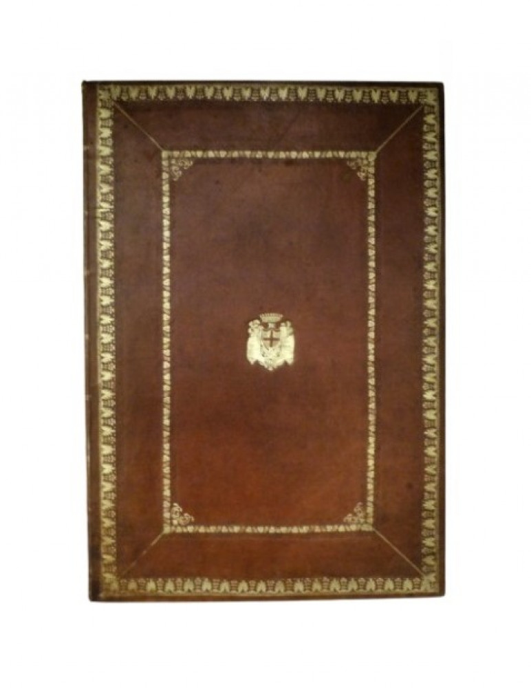 Bella legatura coeva di fattura piemontese alle armi sabaude in pieno marocchino rosso scuro - marrone con corona comitale entro doppio filetto ai piccoli ferri, dorso ornato da ricchi fregi in oro.