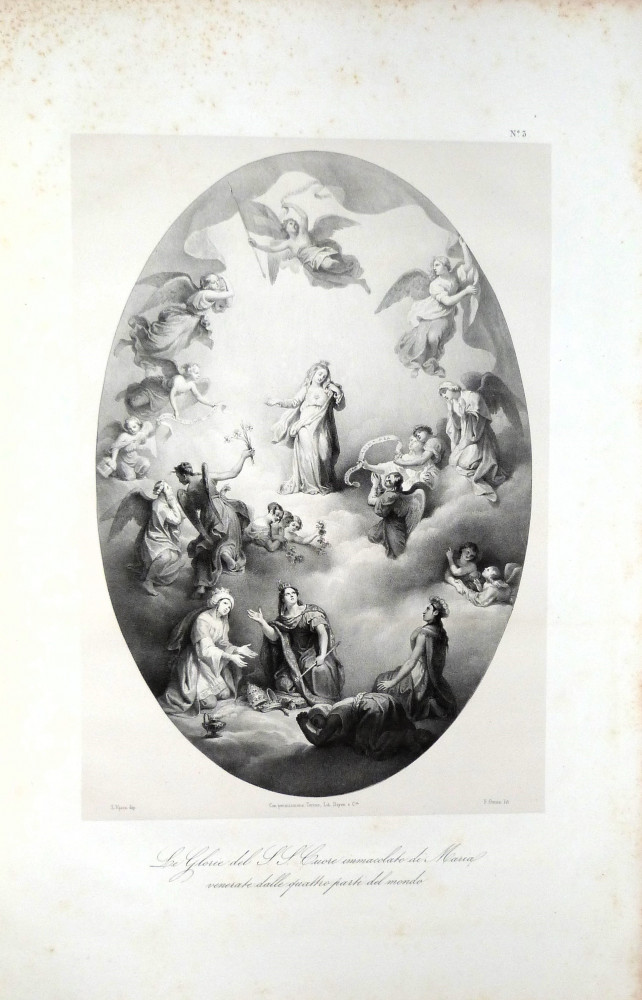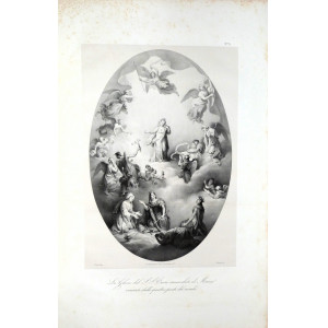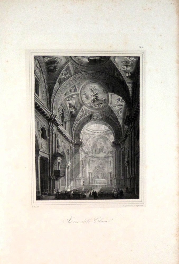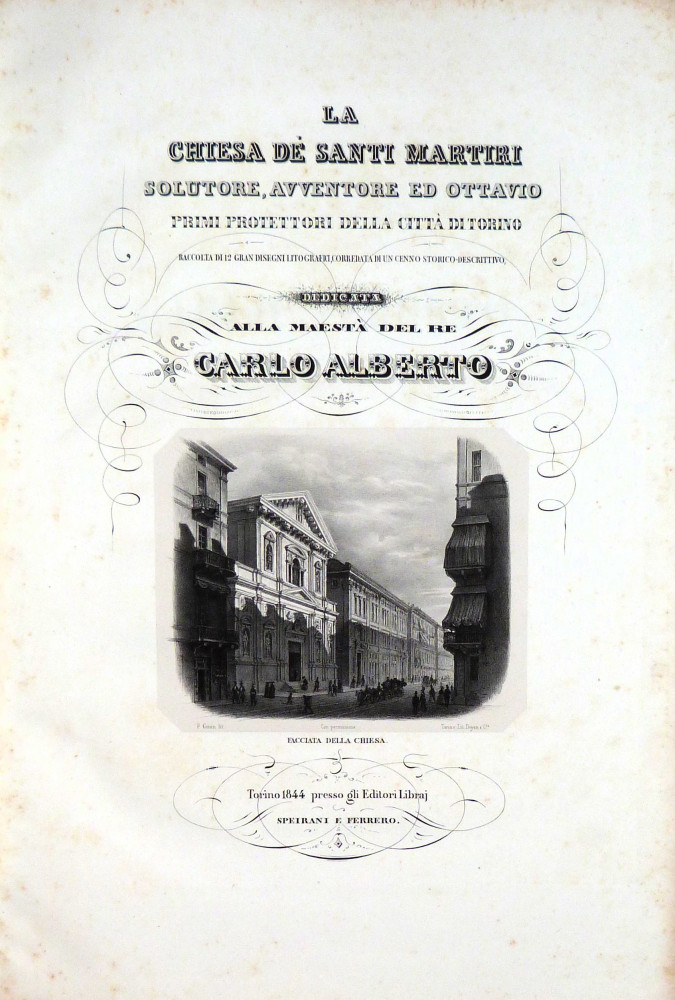 Occhietto, frontespizio, dedica a Carlo Alberto, 12 tavole litografiche di Doyen su disegno di Francesco Gonin, delle quali la prima è una vignetta al frontespizio litografico con veduta della facciata della chiesa su via Garibaldi e le restanti 11, a piena pagina e protette da veline originali, raffigurano l'interno della chiesa con la navata principale, dettagli architettonici, gli affreschi di Luigi Vacca, etc. Il frontespizio litografico, contiene la titolazione entro svolazzi ornamentali.