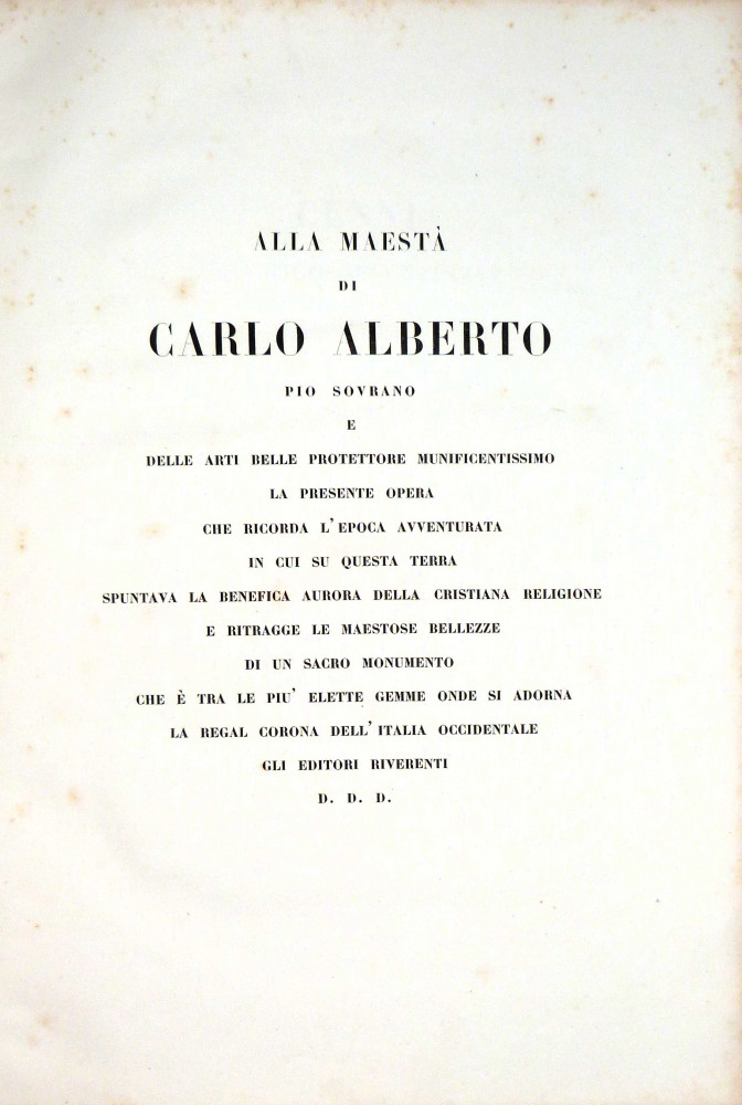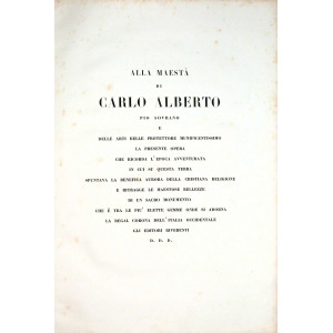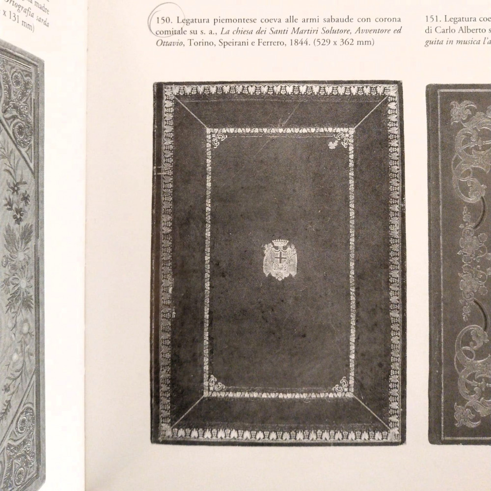 Bella edizione adorna delle grandi tavole di Francesco Gonin, in legatura piemontese alle armi sabaude. Il presente esemplare è stato esposto alla mostra torinese presso la Camera di Commercio "Preziosi in biblioteca", esposizione di legature appartenenti a raccolte private piemontesi, organizzata nell'ottobre del 1994. Fotografata e descritta al n° 150 del volume.
