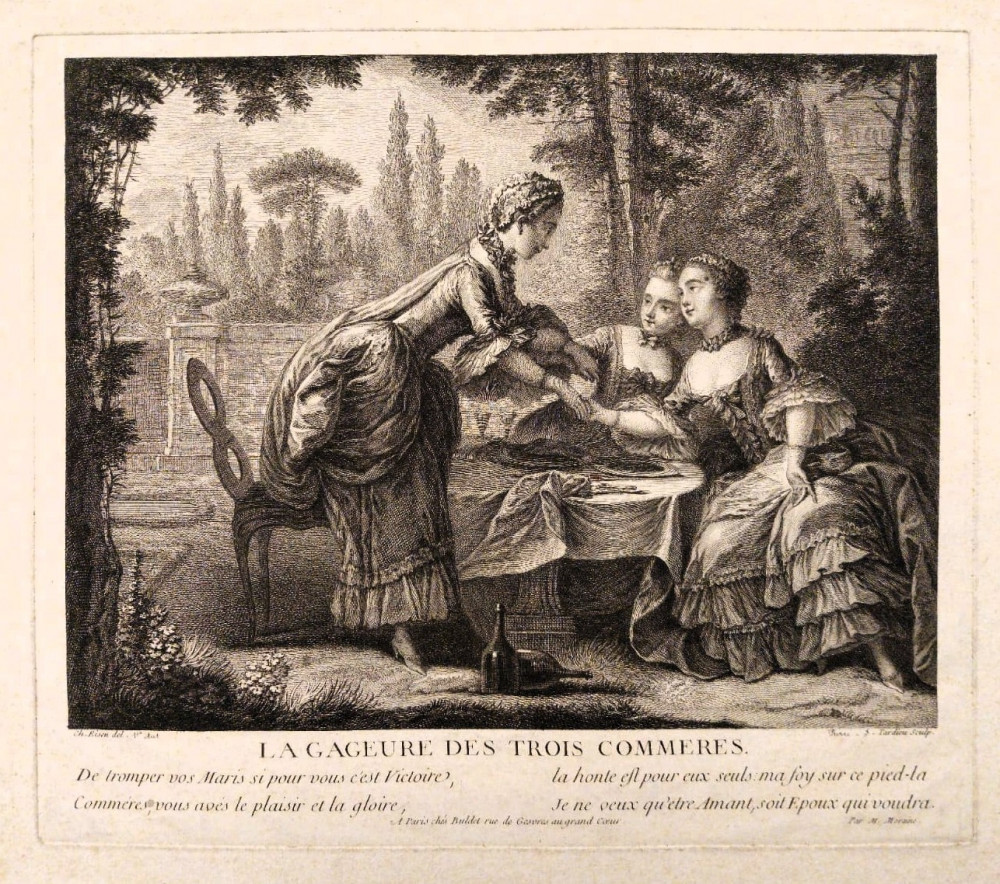 Raffinata e dettagliata esecuzione incisoria raffigurante "La scommessa delle tre comari" ("La gageure des trois commères"), ispirata alla favola di La Fontaine la quale racconta le vicende di tre donne stufe dei tradimenti dei loro mariti, le quali scommettono su chi riuscirà a far rivelare al proprio marito l'infedeltà senza che lui se ne accorga.