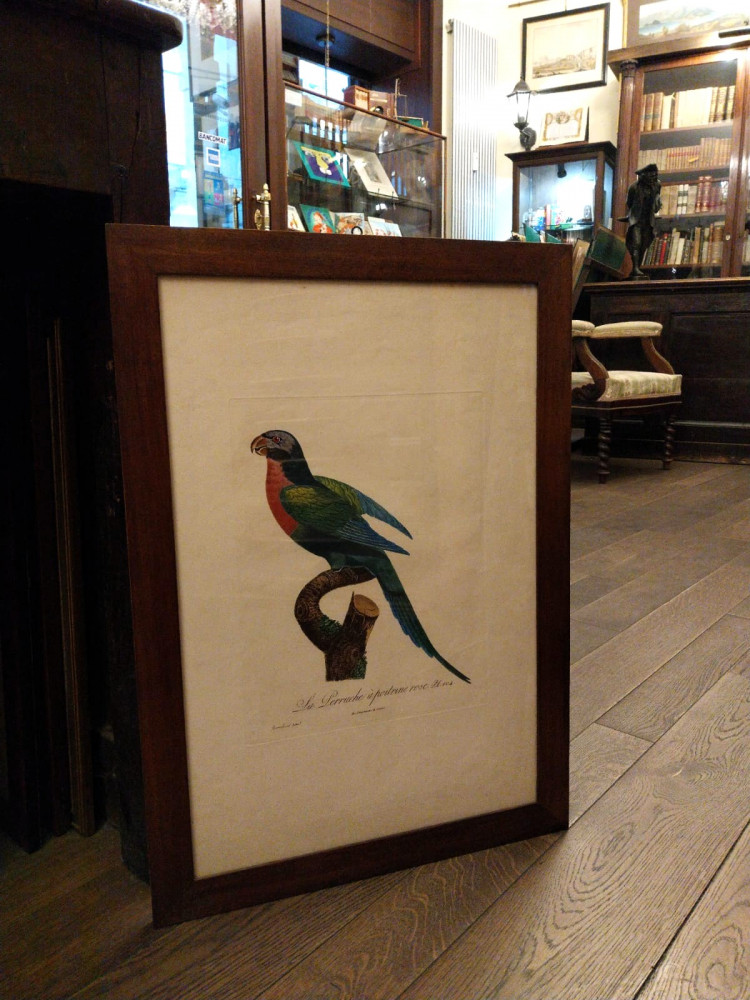 Impressa da Louis Bouquet (*1765 - †1814), presso lo stampatore Langlois, tratta dal dipinto di Jacques Barraband (*1768 - †1809) e inserita nell’opera dell’ornitologo François Levaillant (*1753 - †1824) “Histoire naturelle des perroquets”.
