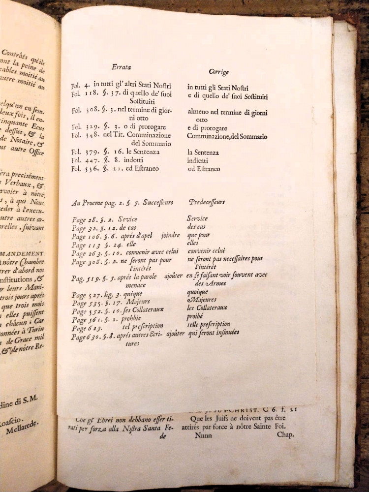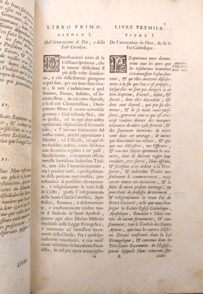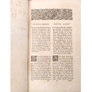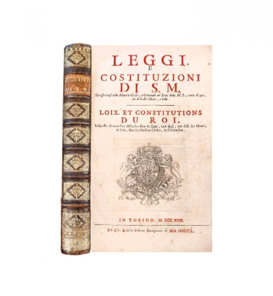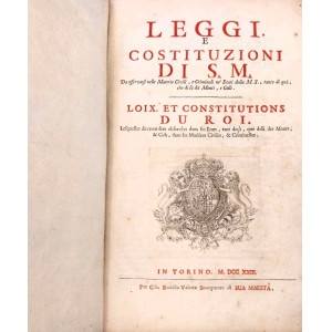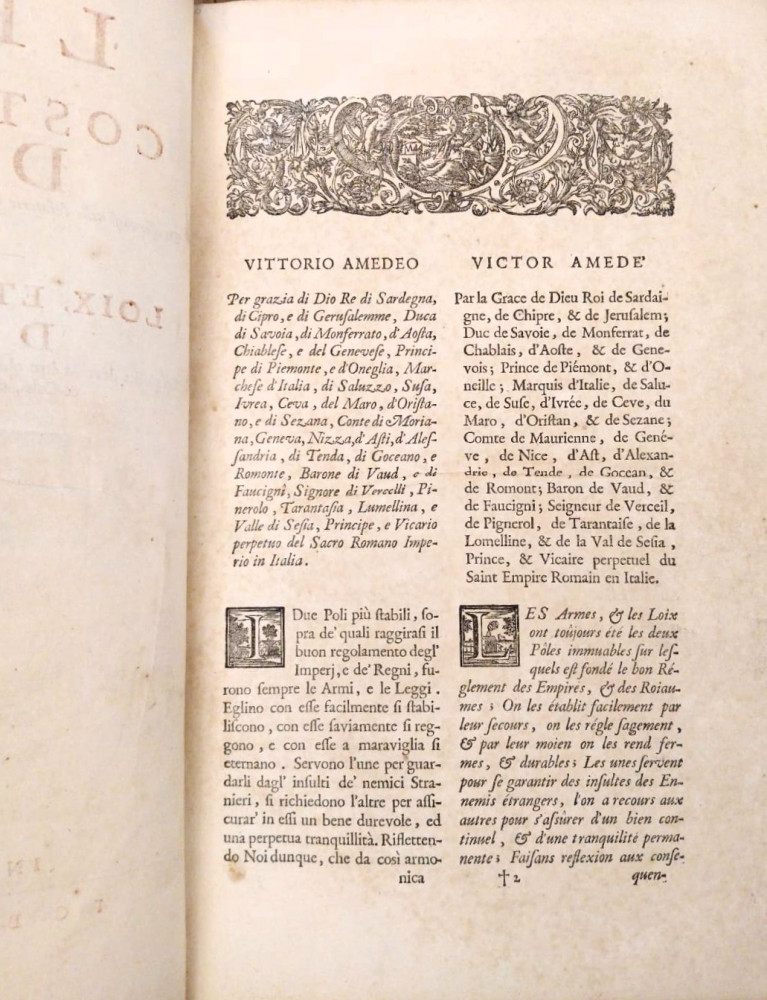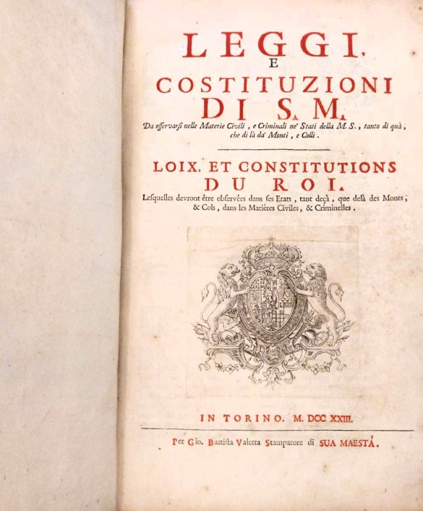 Frontespizio con stemma sabaudo sostenuto da due leoni rampanti e sormontato da corona reale, testo in doppia lingua, italiano e francese, disposto su due colonne, numerosi capilettera semplici, in fine errata e indice.