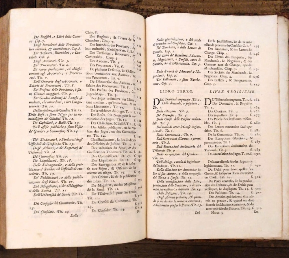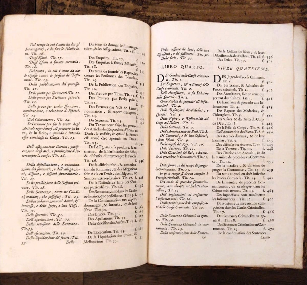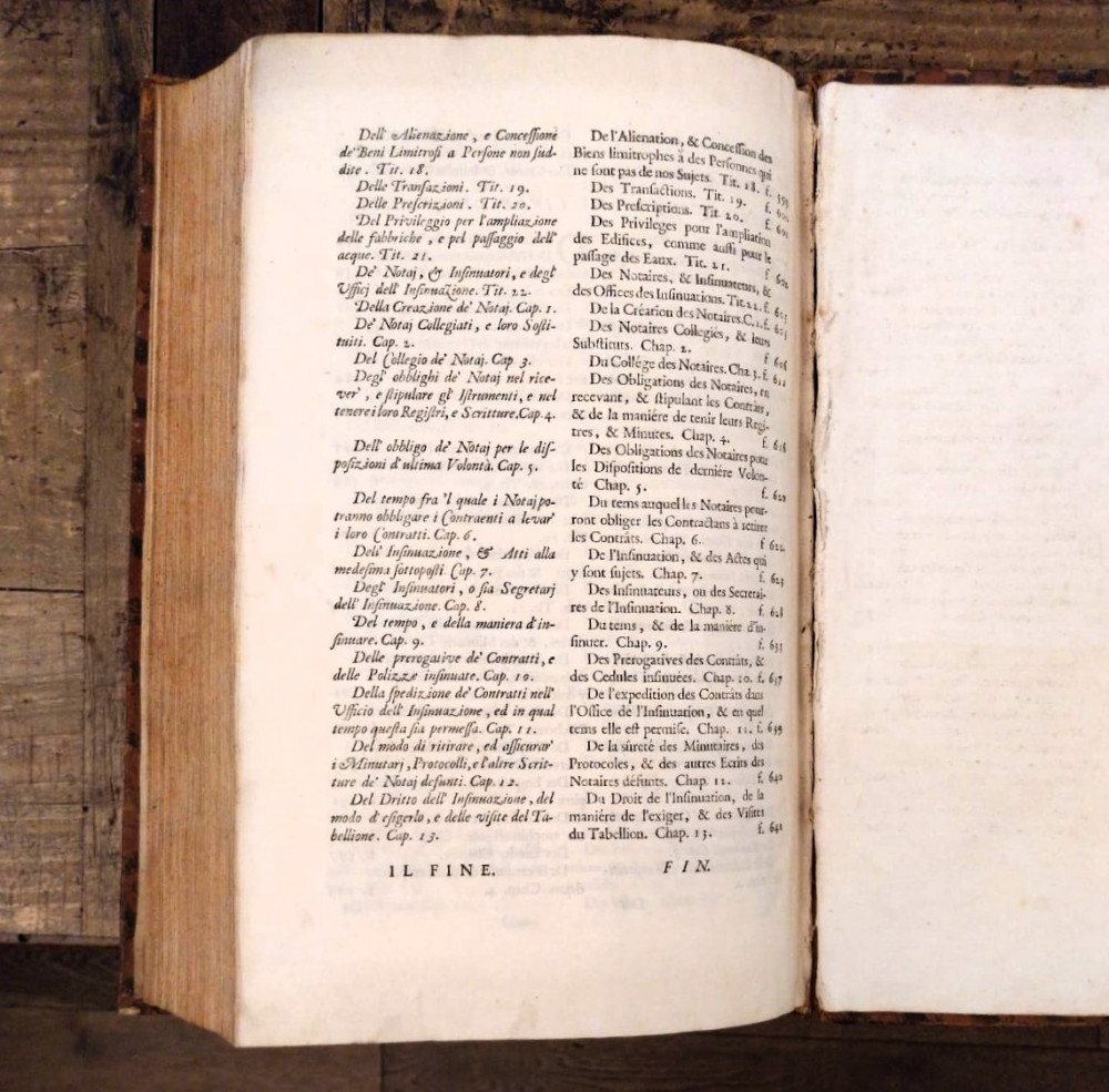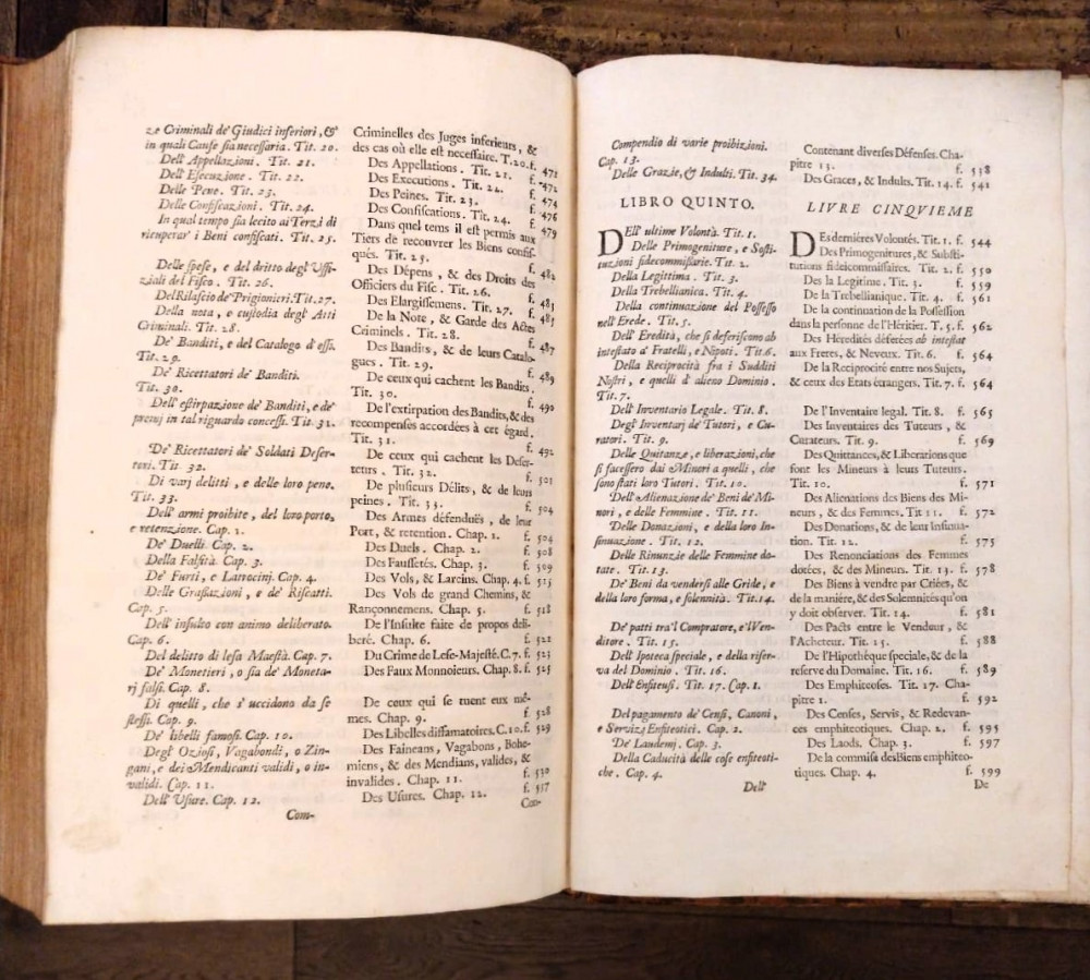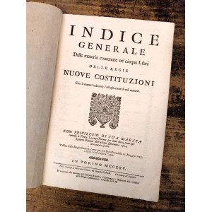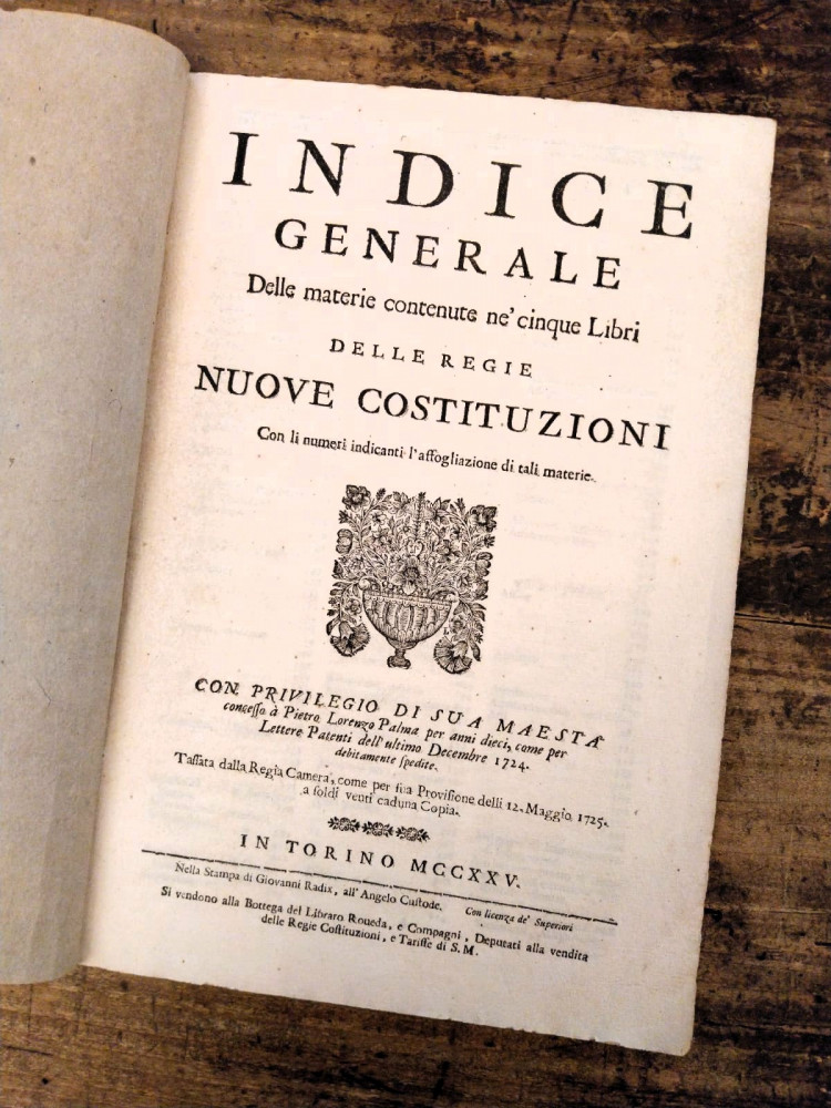Leggi e costituzioni di S. M. da osservarsi nelle Materie Civili e Criminali ne’ Stati della M. S. […]. Torino, Giovanni Battista Valetta, 1723 - Indice generale delle materie contenute ne’ cinque Libri […]. Torino, Giovanni Radix, 1725.