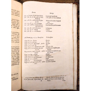 Ottimo stato conservativo della legatura, dell'indice generale separato e dell'opera in generale.  Segnaliamo che l'errata è stata rifilata di 3-4 cm nella parte inferiore senza aver minimamente intaccato il testo.