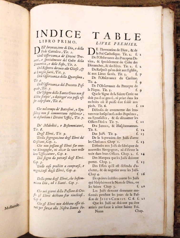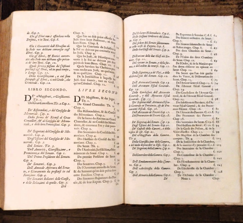 Non comune insieme di leggi e costituzioni, sconosciuto alle bibliografie. L’opera fornisce esaurienti fonti sul tema trattato ed è arricchita dall’indice a parte.