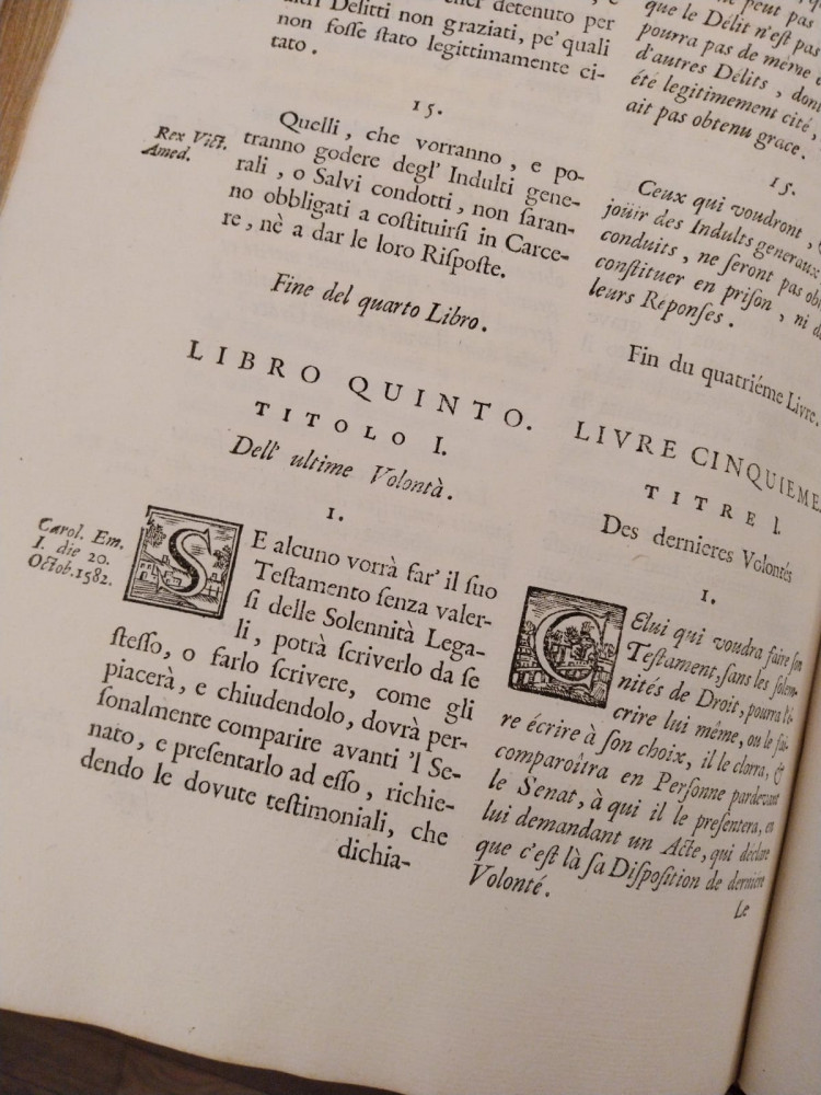 Non comune insieme di leggi e costituzioni, sconosciuto alle bibliografie. L’opera fornisce esaurienti fonti sul tema trattato ed è arricchita dall’indice a parte e dalla robusta legatura in cuoio dell'epoca.