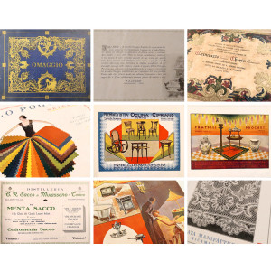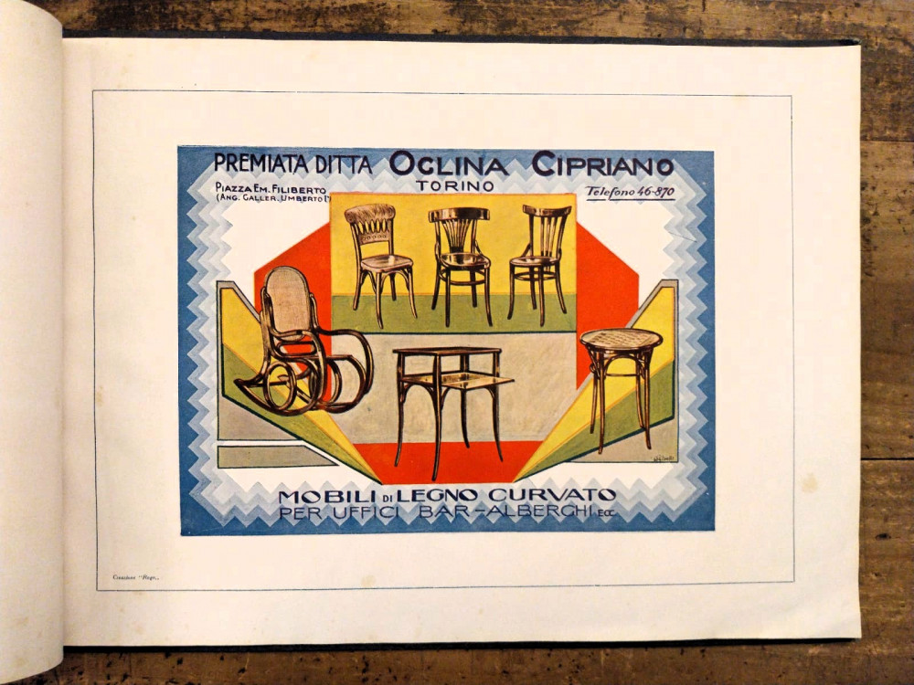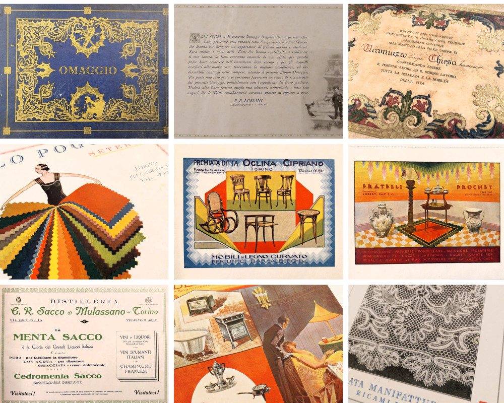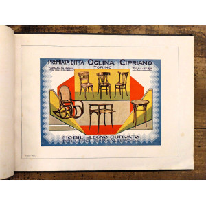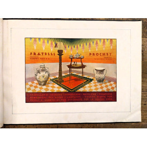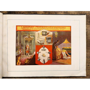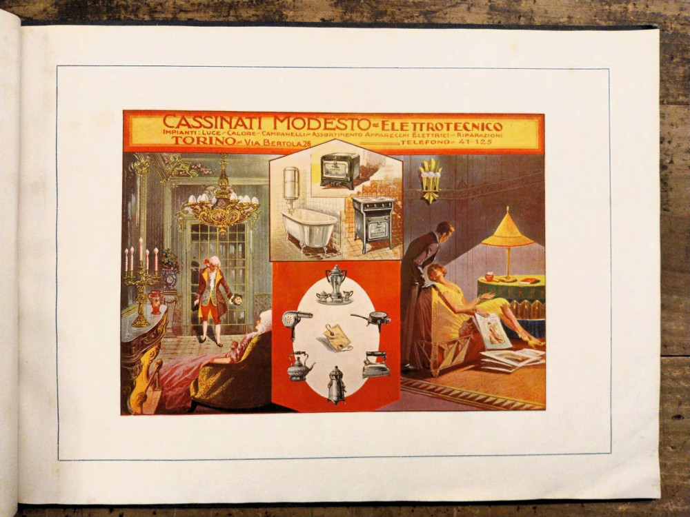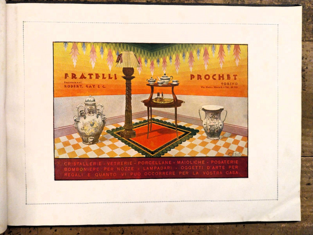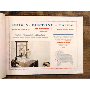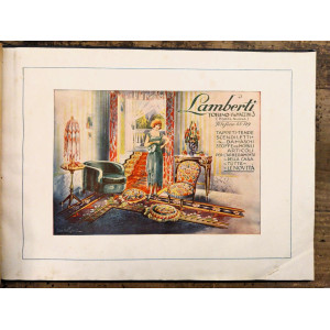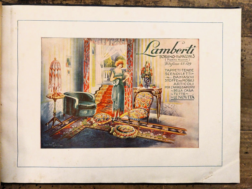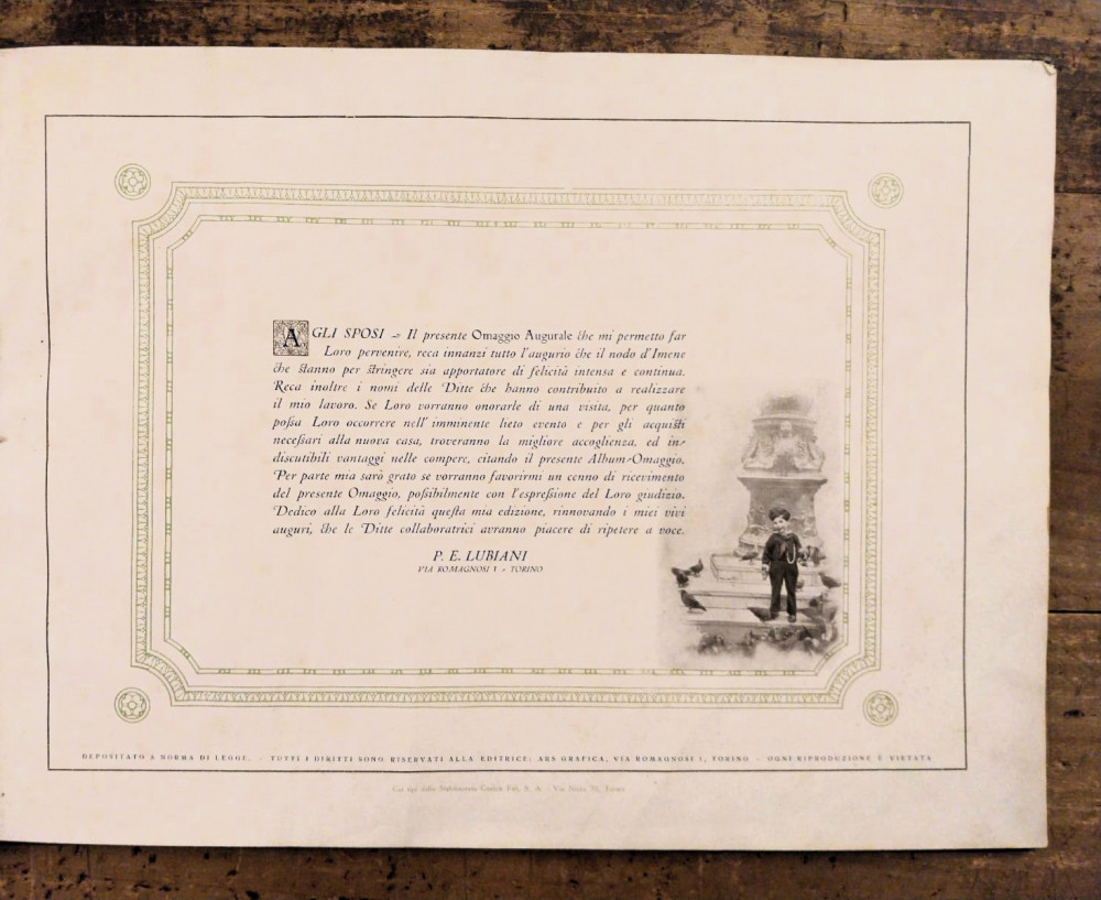 Interessante album augurale destinato a una coppia di sposi, firmato da P.E. Lubiani di via Romagnosi n° 1 a Torino, eseguito dallo stabilimento grafico Foà. L'album è un invito per gli sposi a visitare le ditte pubblicizzate per acquisti relativi alla nuova abitazione.