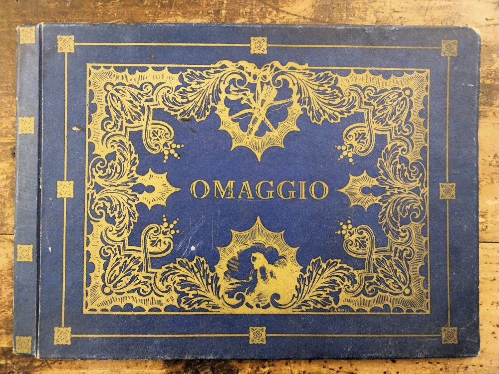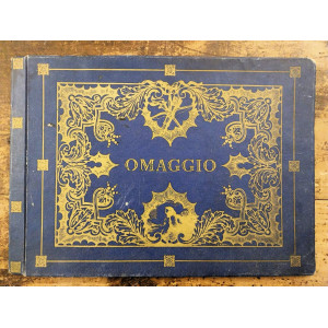 Legatura in piena tela percallina blu, con ricca bordura in oro al piatto anteriore e rosoni che incorniciano la scritta "Omaggio " nella parte centrale.