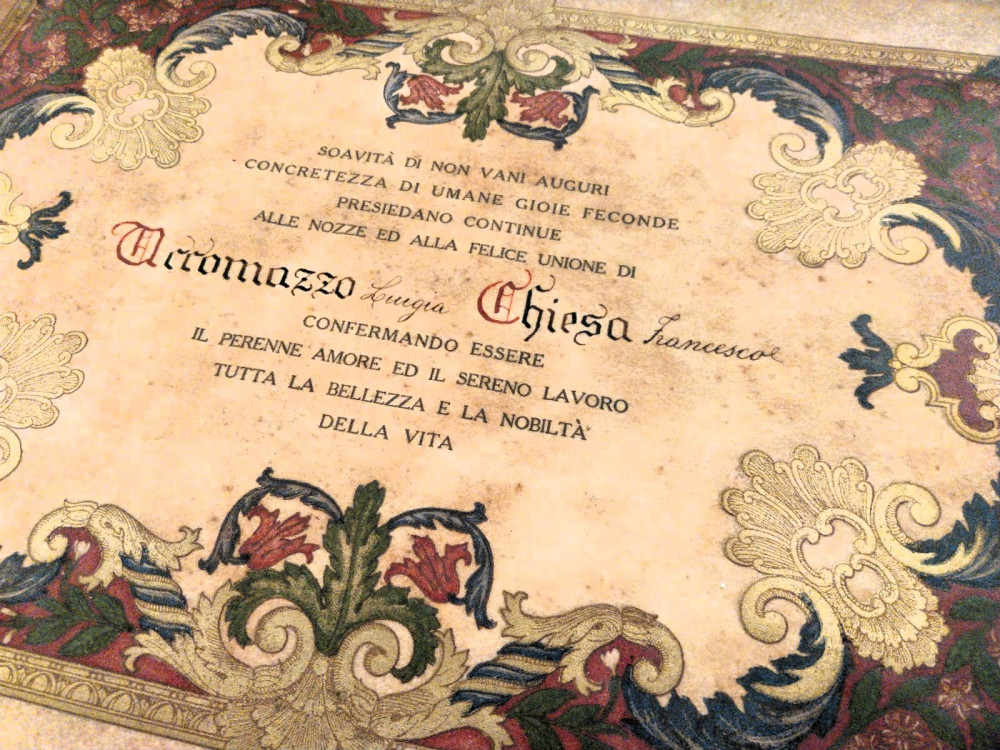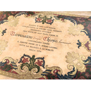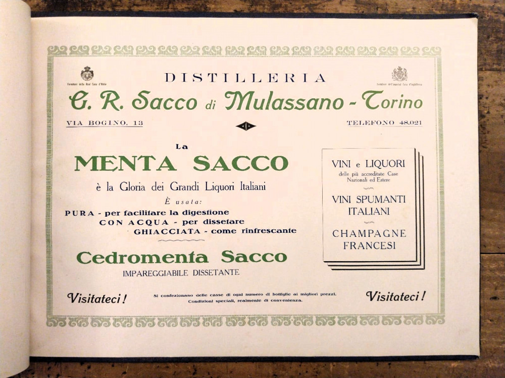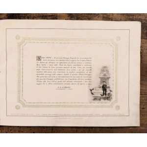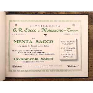 In-folio oblungo, 2 cc. non num. di presentazione dell'opera e pagina su carta pergamena di dedica agli sposi Luigia Accomazzo e Francesco Chiesa, 27  tavole non num di pubblicità di ditte torinesi.